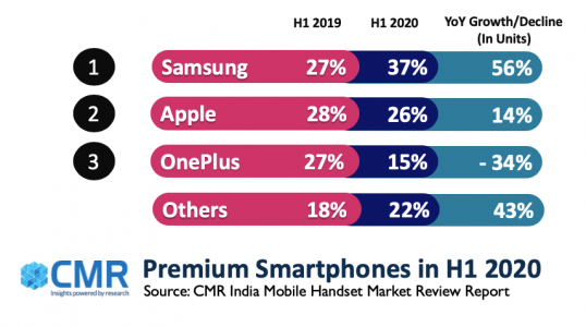 印度高端智能手机出货量在2020年上半年同比增长18%。三星以37%的市场份额领先,苹果以26%的份额紧随其后,一加以15%的份额远远排在第三位。