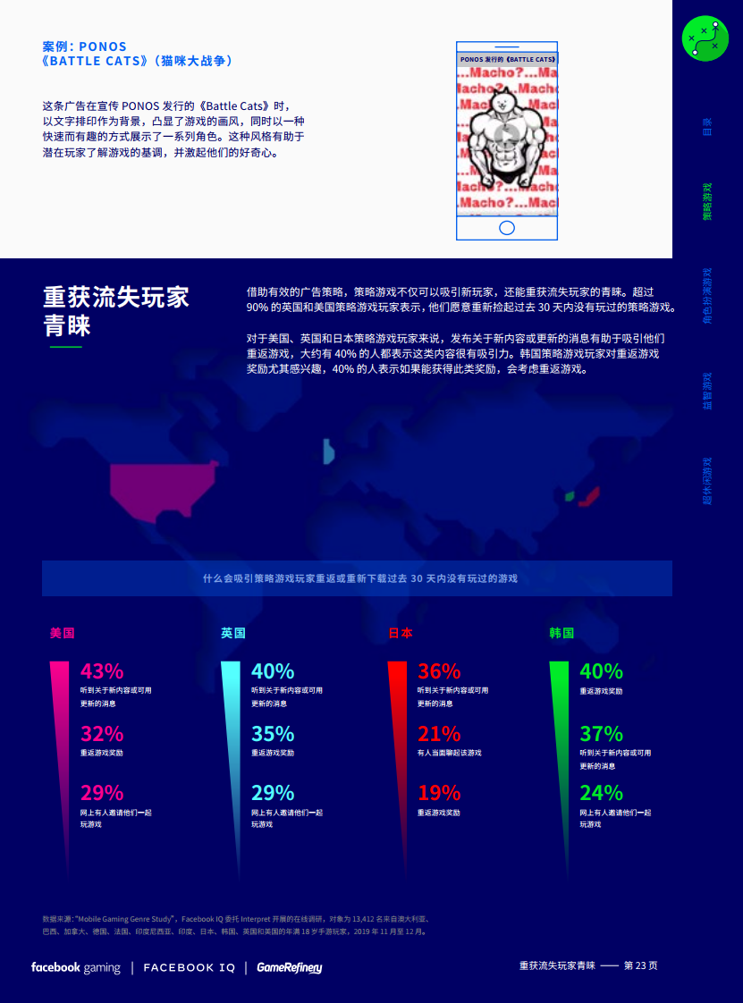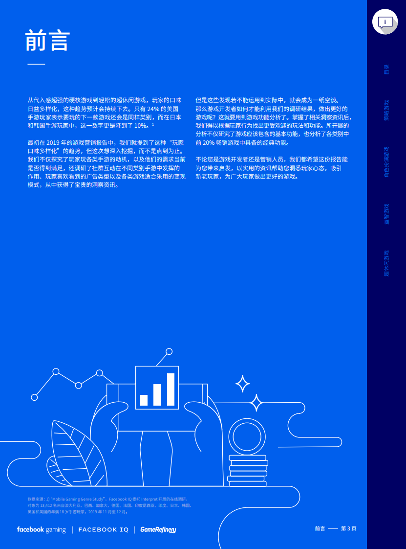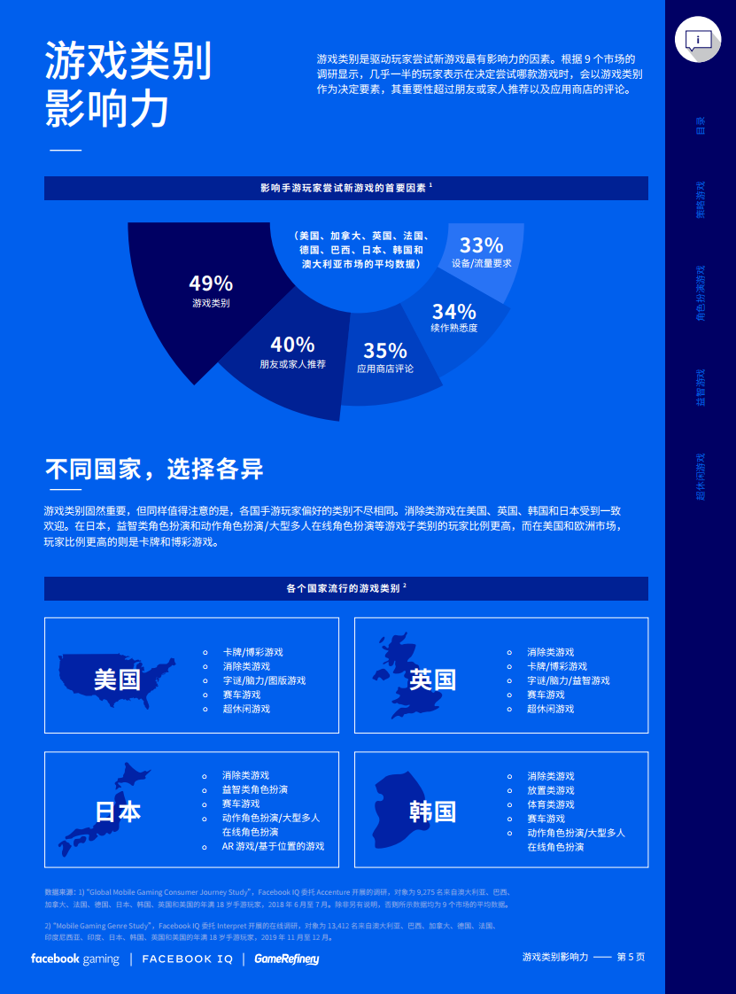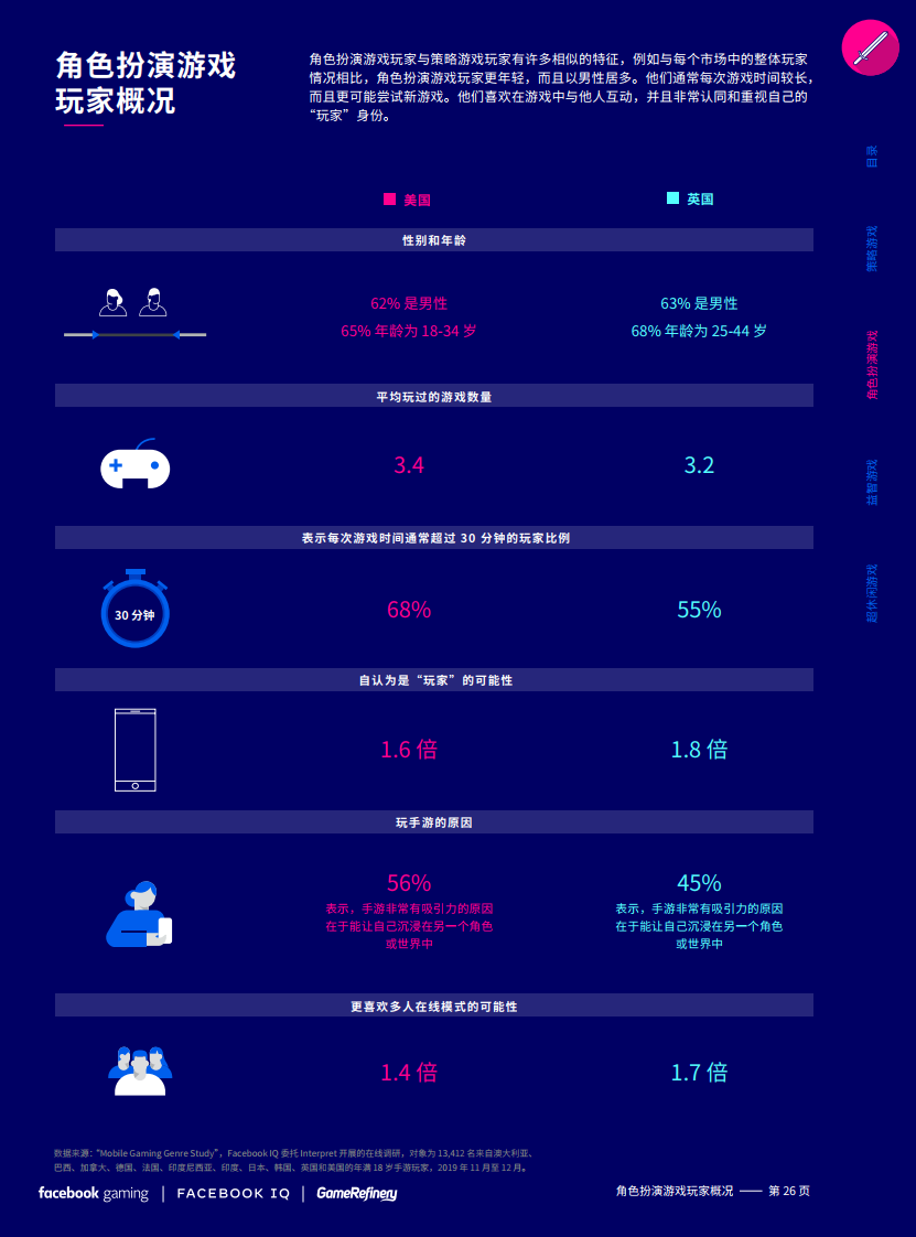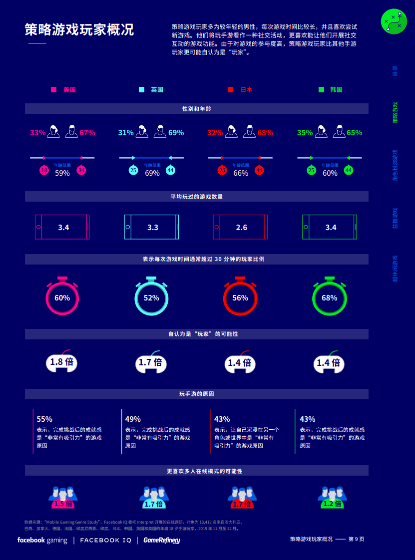 为了探索游戏类别在手游市场中发挥的作用, Facebook Gaming与 Facebook IQ 和 GameRefinery 联手,经过 6 个月的全面分析与精心制作,推出了这份手游洞察报告。报告跨四大主要市场,全面阐述了四大主要游戏类别都吸引了哪类玩家,这些玩家分别有什么人口统计上的特征等等,并就以下四个维度展开了具体的分析: