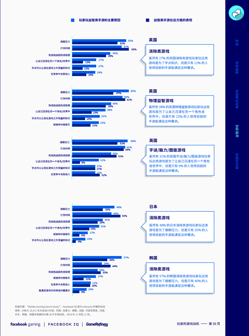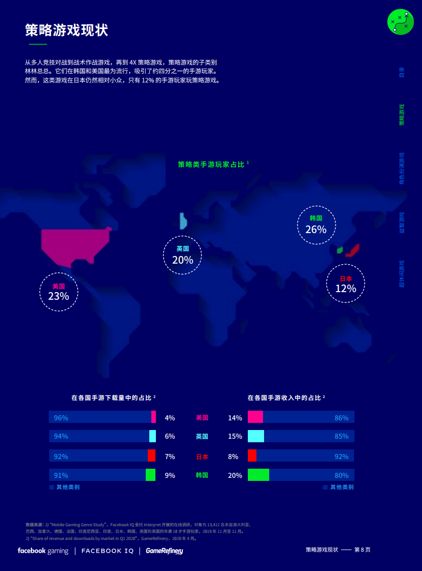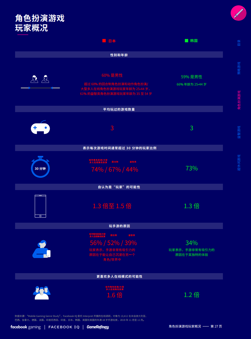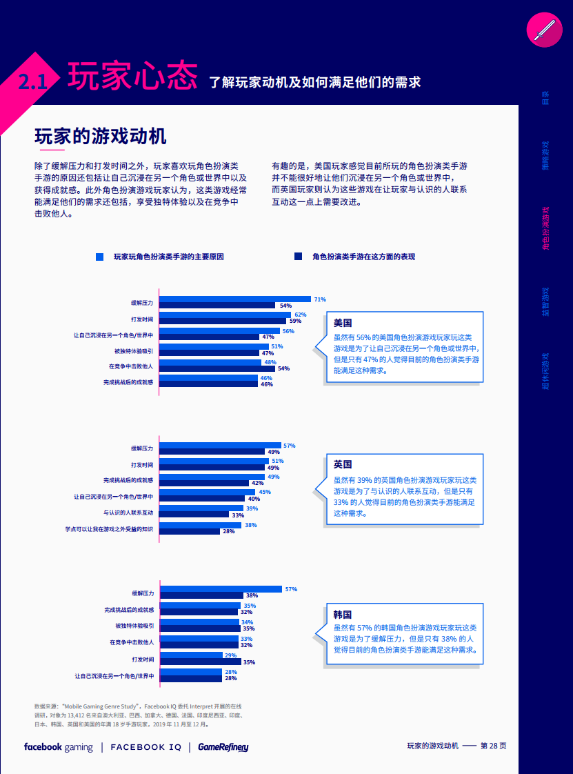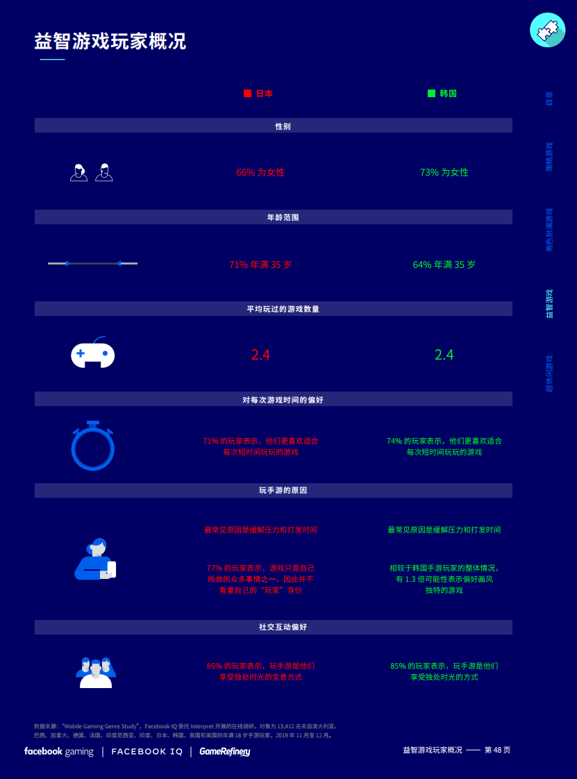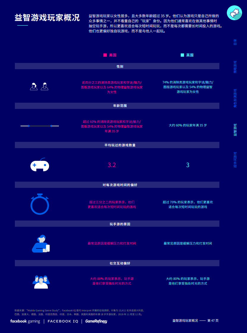 为了探索游戏类别在手游市场中发挥的作用, Facebook Gaming与 Facebook IQ 和 GameRefinery 联手,经过 6 个月的全面分析与精心制作,推出了这份手游洞察报告。报告跨四大主要市场,全面阐述了四大主要游戏类别都吸引了哪类玩家,这些玩家分别有什么人口统计上的特征等等,并就以下四个维度展开了具体的分析: