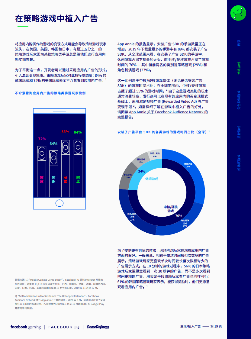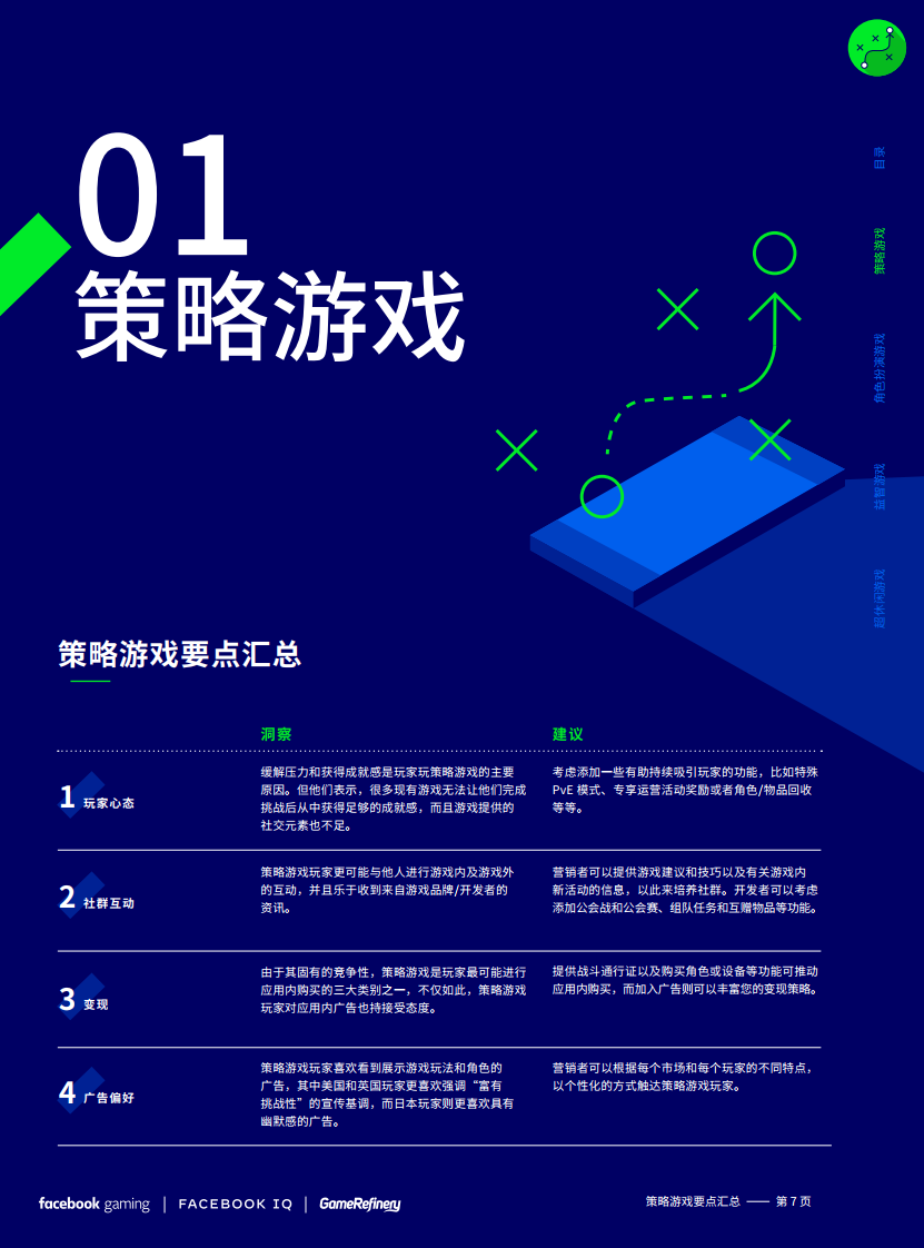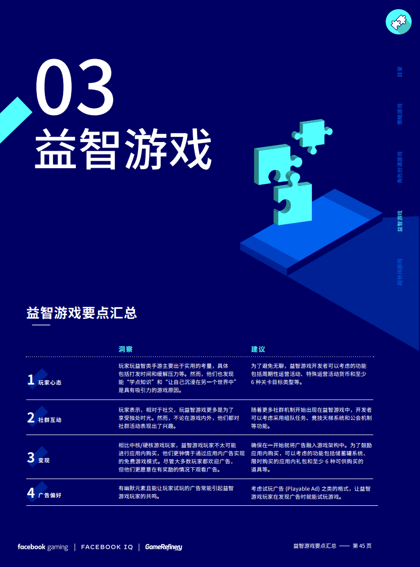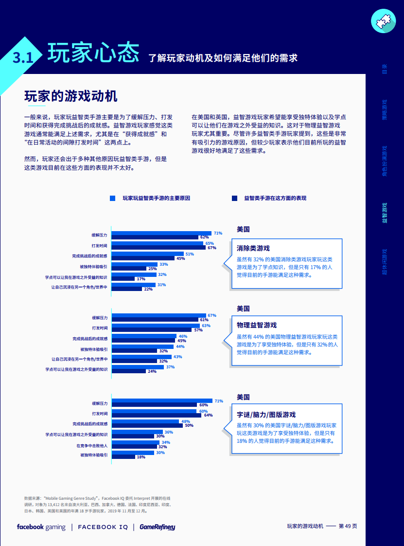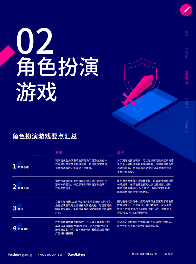 为了探索游戏类别在手游市场中发挥的作用, Facebook Gaming与 Facebook IQ 和 GameRefinery 联手,经过 6 个月的全面分析与精心制作,推出了这份手游洞察报告。报告跨四大主要市场,全面阐述了四大主要游戏类别都吸引了哪类玩家,这些玩家分别有什么人口统计上的特征等等,并就以下四个维度展开了具体的分析: