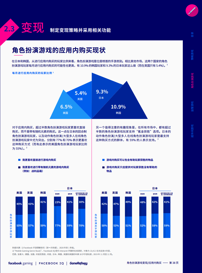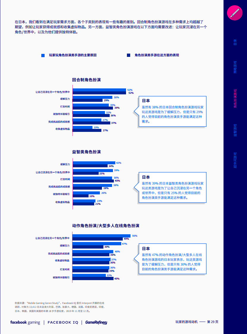 在日本,超过三分之一 (36%) 的手游玩家表示,将自己沉浸在另一个角色或世界中的游戏功能非常吸引人。此外,日本手游玩家更注重游戏的审美体验,其中 52%的日本玩家表示,他们更喜欢画面精美有格调的手游,而美国玩家的这一比例为 38%。因此,日本玩家更有可能玩各种类别的角色扮演游戏,例如,益智类角色扮演和动作类/大型多人在线类 (MMO) 角色扮演。