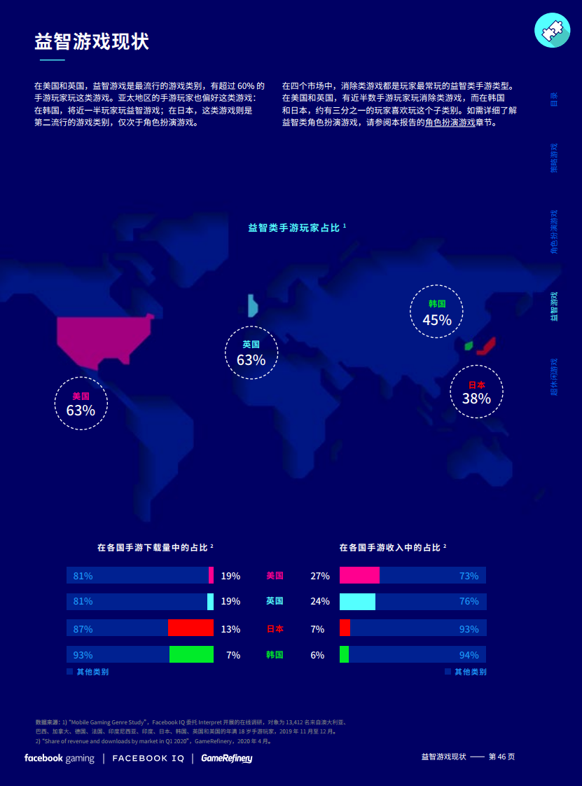 尽管消除类游戏和赛车游戏在各市场上一直很受欢迎,但与其他地区的玩家相比,北美和欧洲国家(例如美国、加拿大和英国)的玩家更喜欢卡牌游戏、博彩游戏和超休闲游戏。