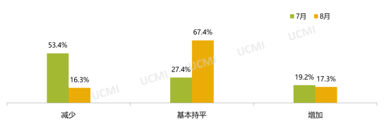 调查显示,8月份市场总需求 “增加”的比例为17.3%;“基本持平”的比例为67.4%;“减少”的比例为16.3%。