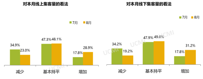 调查显示,8月份线上、线下集客量有所减少。其中认为线上集客量“持平”的经销商比例为48.1%,“增加”的比例为28.9%“减少”的比例为23.0%;认为线下集客量“增加”的经销商比例为31.2%,“持平”的比例为49.6%,“减少”的比例为19.2%。