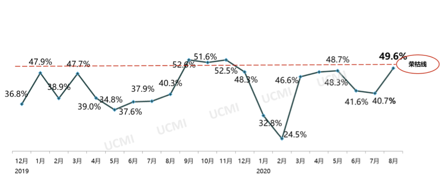 2020年9月1日,中国汽车流通协会发布最新一期“中国二手车经理人指数”(UCMI)。本期UCMI结果显示,8月份二手车经理人指数为49.6%,处于荣枯线以下,二手市场经营状况逐渐向好,但仍处在不景气区间。