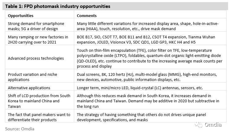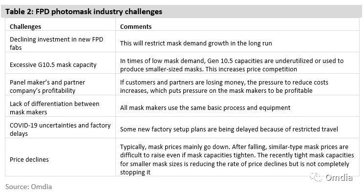Omdia :2020年FPD光罩市场将增长到1000亿日元以上 要点 光罩行业是平板显示(FPD)供应链最健康的板块之一。 预计2020年收入将增长2%,超过1000亿日元(约合9.36亿美元),创造出比2012年大一倍的市场。 由于需求低迷和产能过剩,价格下滑严重,Gen 10.5是未能达到之前预期的一个光罩细分市场。 FPD光罩市场有被四家主要厂商主导的趋势,他们的份额都非常接近,各占20%左右。 Omdia FPD光罩市场研究 Omdia的FPD光罩市场预测通常在每年春末更新。2020年的调查发现,尽管Gen 10.5光罩市场疲软,但总体上FPD光罩领域大多保持健康,过去几年的起伏比整体FPD市场小。 FPD光罩市场比许多其他细分市场更有弹性,也更有优势 虽然FPD光罩行业也不能幸免于风险,但与FPD行业其他大多数领域和当前大环境相比,FPD光罩行业相对健康。Omdia认为,目前机会大于风险;2020年FPD光罩行业的增长将超过2019年,许多光罩供应链公司将保持盈利。 光罩在FPD产业中发挥着独特的作用。面板制造商不需要购买大量的光罩来生产大批量的面板。但是,为了不断开发产品,与竞争对手进行差异化竞争,最大限度地提高利润率,购买种类繁多、数量众多的光罩是必要的。因此,即使在大多数材料和设备公司因工厂利用率降低或计划被推迟或取消的困难时期,光罩制造商也不会受太大影响。 在生产力、性能和成本方面,没有其他图案化技术能够匹敌或击败光刻技术。2020年来自数字光刻技术的威胁虽然没有消失,但与几年前相比似乎有所减弱。 尽管有许多积极的趋势,但从长远来看,FPD光罩市场可能会反映其客户 ─ 面板制造商的趋势。随着FPD产业与FPD供应链其他环节的成熟,Omdia预计光罩领域将面临以下表2所列的挑战。 FPD光罩市场规模 从历史上看,光罩市场的收入一直在波动。然而,自2013年以来,随着智能手机的普及,它们也一直 ─ 除2016年外 ─ 持续增长。采用低温多晶硅(LTPS)LCD和有源矩阵OLED(AMOLED)的智能手机通常比非晶硅(a-Si)LCD使用更多的光罩。此外,智能手机的寿命相对较短,而且有许多不同的设计,这些都推动了光罩的使用。同时,中国FPD制造能力的提升;应用、技术、尺寸和分辨率变化的增加;以及Gen 10.5工厂的加速发展,都对光罩产业产生了积极的影响。 Omdia预计2020年光罩市场收入将增长2%,超过1000亿日元(约合9.36亿美元),创造出一个比2012年大一倍的市场。 与2019年的预测相比,1620×1780毫米光罩(专门用于Gen 10.5 的独特大尺寸)的需求被下调。这部分是由于预期的下调,但主要是由于价格以比之前的假设以更大的幅度下降而导致的。乐金显示无限期推迟其P10 Gen 10.5白光OLED(WOLED)工厂,光罩的需求减少,产能过剩增加,加剧了Gen 10.5光罩价格的下跌。LG Innotek预计乐金显示对1620x1780mm光罩的需求将在2020年激增,因此订购了两台针对Gen 10. 5光罩写入而优化的P10图案生成器。虽然目前只有一台是为Gen 10.5准备的,但这些产能进一步促进了1620x1780mm图案生成器的过剩。自2019年初以来,在三家新的光罩制造商进入供应链后,Gen 10.5光罩价格已经下降了70-80%,不过仍然相当昂贵。既然现在Gen 10.5光罩价格如此之低,一个值得关注的趋势是,在面板厂商试图最大限度地提高其工厂利用率的情况下,他们是否会由此在其Gen 10.5工厂开发和生产更多的面板类型和尺寸。 除1620x1780mm光罩外,光罩供需平衡,小尺寸光罩价格侵蚀不大。 Omdia预测未来几年光罩市场收入基本持平,因为面积和用量的增长放缓被价格下降所抵消。尽管表1中列出了积极的趋势,但新工厂的投资放缓以及韩国液晶电视和其他传统产能的停产都会限制了未来的增长。 光罩制造商的市场份额 Photronics在中国合肥建立了新工厂,值得注意的是,没有其他光罩制造商像它这样积极地增加产能。该工厂目前正在运行两台P10图案生成器,以后还将增加一台用于高端OLED光罩图案的尖端写入机。与2018年相比,Photronics的市占率上升,SK-Electronics(SKE)的市占率下降,主要是因为Gen 10.5光罩竞争加剧。 图2:2019年FPD光罩收入市场份额 FPD光罩市场有被四家主要厂商主导的趋势,这四家厂商的份额都非常接近,各占20%左右。虽然中国大陆占据了FPD光罩需求的50%以上,但大部分光罩还是在日本、韩国和中国台湾生产。在中国政府和中国面板厂商的支持下,国内光罩厂商Supermask和Newway正在增加产能。即便如此,光罩市场的低量、高端、成熟的特性意味着国内厂商可能需要多年的时间和大量的投资才能获得有竞争力的份额,不过,他们将继续压价。 更多阅读:Omdia:2023 年大尺寸显示面板出货片数年同比增长 0.8%Omdia :2022年超过30%的电视面板将由10代和10.5代产线生产Omdia:预测平板显示面板工厂利用率有望从2024 年下半年迎来复苏和增长Omdia:预测:到 2031 年移动 PC 市场OLED显示屏年均复合年增长率将达到 37%Omdia:工业用途半导体市场概况Omdia:2026年起内嵌式触控型面板将占汽车显示面板市场出货量的 50%以上Omdia:2022年中小型尺寸(9.0英寸及以下)AMOLED出货量为 7.62 亿Omdia:预计2022年OLED笔记本电脑面板出货量可能达到近600万片Omdia:预计到 2024 年电视显示面板出货面积将达到 2 亿平方米Omdia:预计2022年第三季度面板厂产线产能利用率跌至 10 年最低Omdia:2022年第一季度半导体行业季度洞察Omdia:预测 2028 年数据中心冷却市场规模将达 168.7 亿美元Omdia:2022年4月TFT LCD 面板出货量环仅有 1 亿 9500 万片 同比下降 15%Omdia:预
