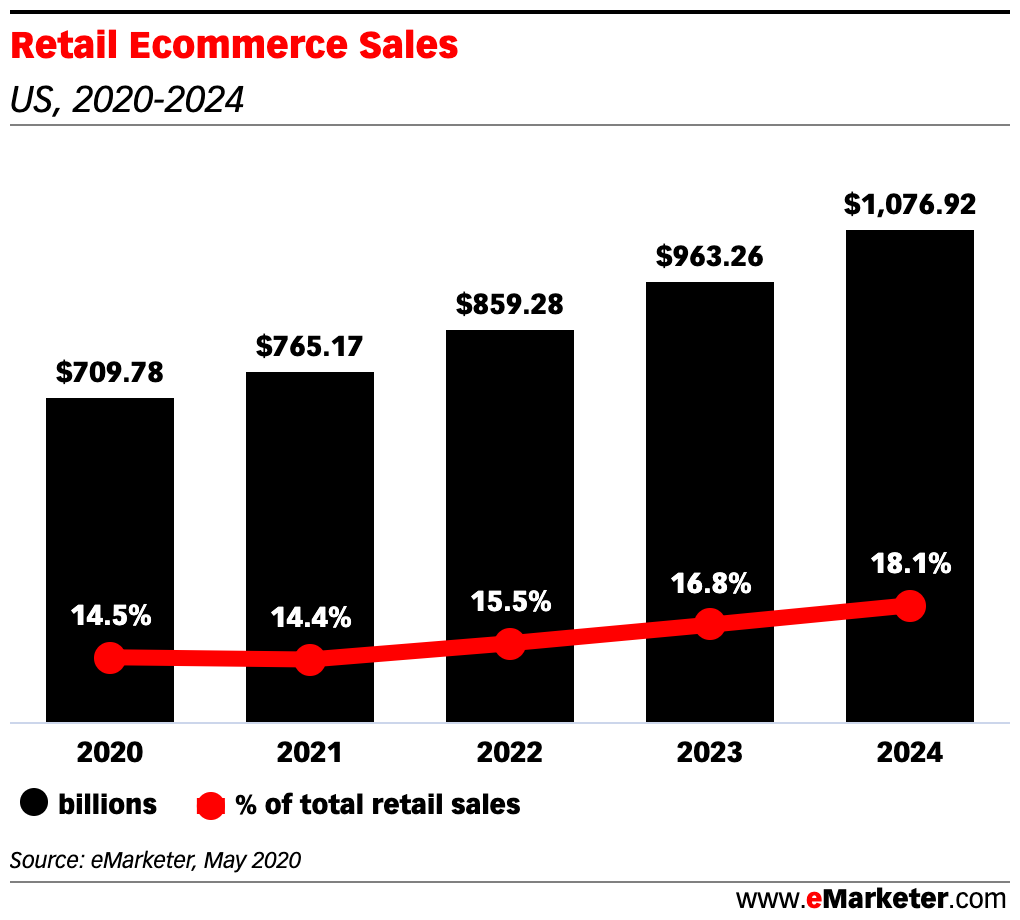 eMarker还预计,在封锁解除后,电子商务将保留这一增加的零售市场份额。这场大流行只会加速正在进行的向该渠道的转变。即使商店重新开张,实体销售反弹,预测电子商务在2021年零售总额中的份额只会下降0.1%,直到2024年每年都会增加超过1个百分点。到那时,美国的电子商务销售额将超过1万亿美元,占美国零售总额的18.1%。