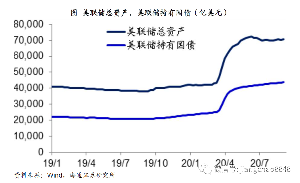 其次看美联储资产负债表。截止9月2日,美联储总资产为7.07万亿美元,虽然比前一周小幅上升,但仍低于6月10日创下的7.22万亿美元的峰值水平。也就是说,虽然美联储并没有宣布退出不限量的量化宽松货币政策,但从实际操作来看,在6月份以后其虽然还在继续买入国债,但总体量宽并没有进一步加码。