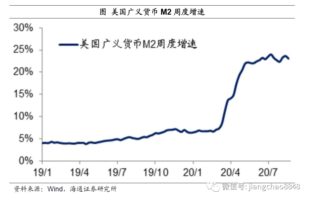 最后来看广义货币M2的周度增速,其最高值是7月13日的24%,而截止8月24日的增速为23.1%,也就是说最近一个月的广义货币增速没有再继续上升,而是出现了筑顶回落的迹象。