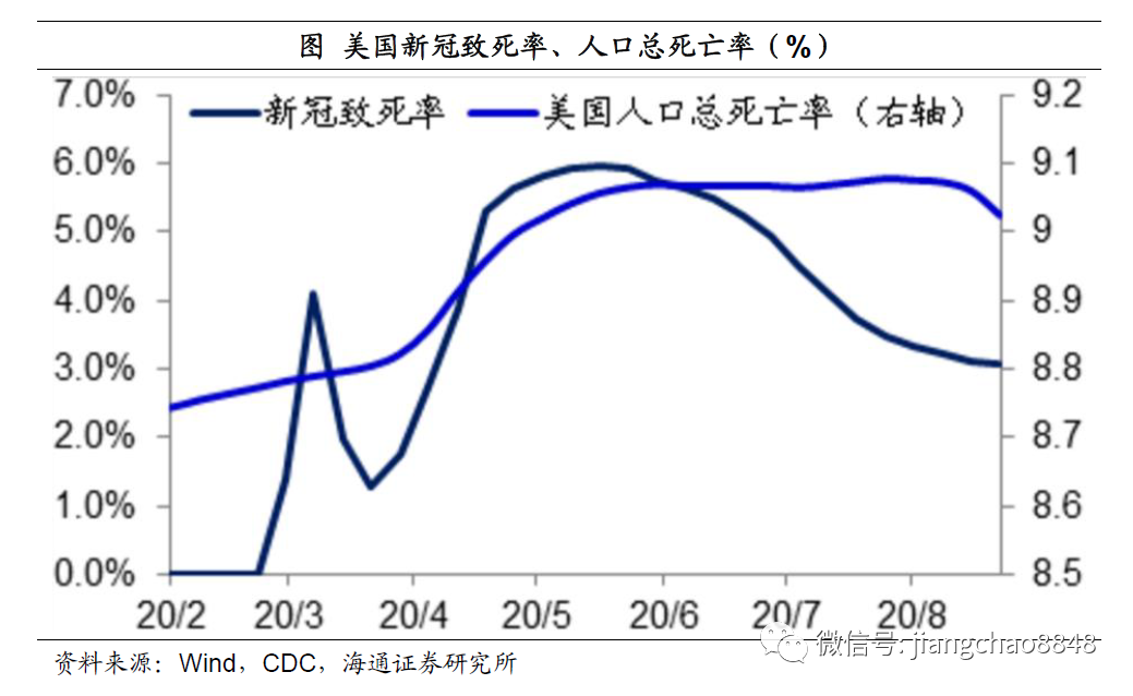 为何实体经济受损程度有限?在最开始,我们都很担心新冠卫生事件是一场类似于2003年SARS的大瘟疫,SARS当年的致死率高达11%,而部分国家初期新冠的致死率也一度接近10%。但目前美国的新冠死亡率已经从最高的6%降至3%,而且还在继续下降。从美国人口的总死亡率来看,虽然在卫生事件的高峰期有微小的上升,但依然维持在9‰左右的正常水平,并且近期已经开始下降,这说明新冠卫生事件更加类似于一场巨大号的流感。