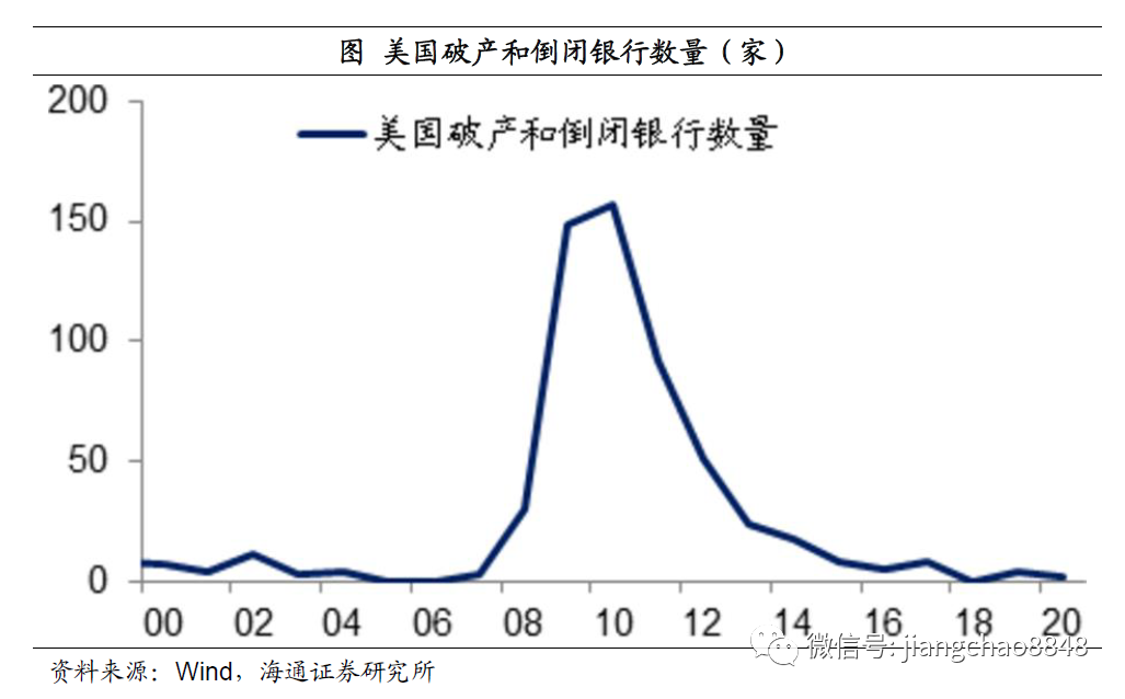 例如在08年次贷危机的过程中,我们可以看到美国破产和倒闭的银行数量大幅上升,在2008年有30家,到2009/2010两年都接近150家。然而在这一次的新冠卫生事件期间,到目前为止美国只有两家银行倒闭被接管,这意味着美国的金融体系几乎完好无损。