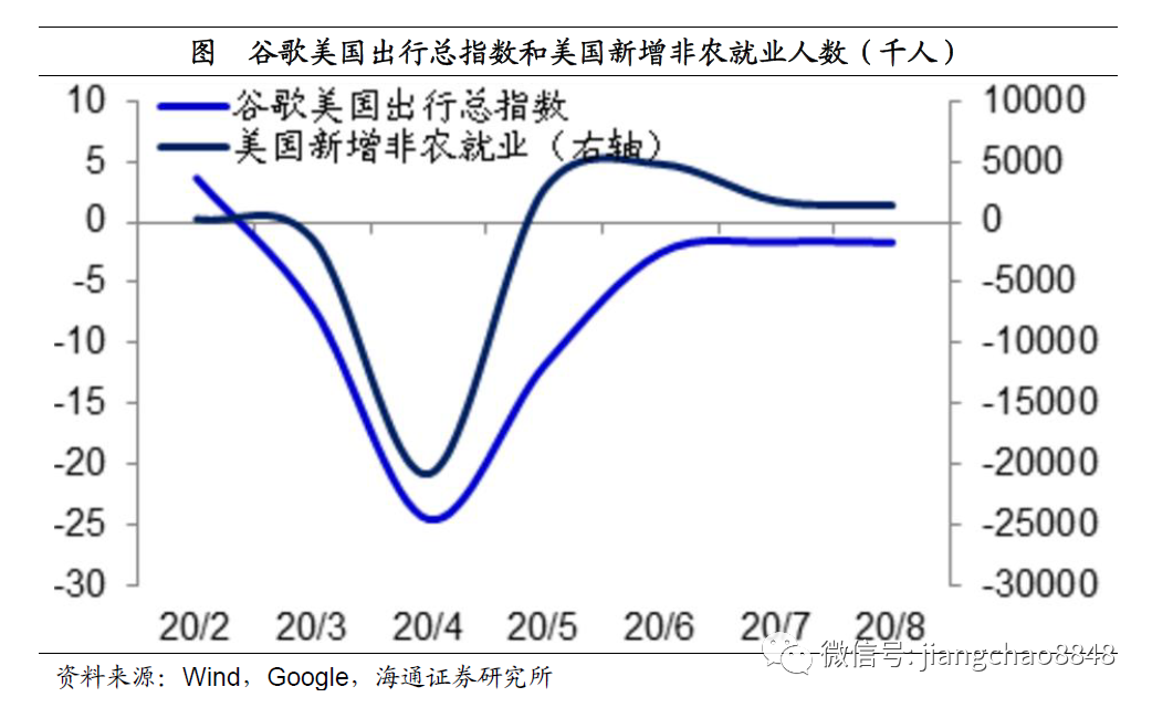 但这一次的经济和就业损失之所以出现,在于卫生事件导致了居家隔离,大家无法出门工作消费。而在卫生事件缓解之后,随着人群重新出门,其实就业和经济就回来了。谷歌的数据显示,美国出行冻结最严重的是4月份,当月共减少了2100万个工作机会。而在5月份以后居民出行持续改善,同时在过去的4个月美国已经恢复了1060万个工作机会。