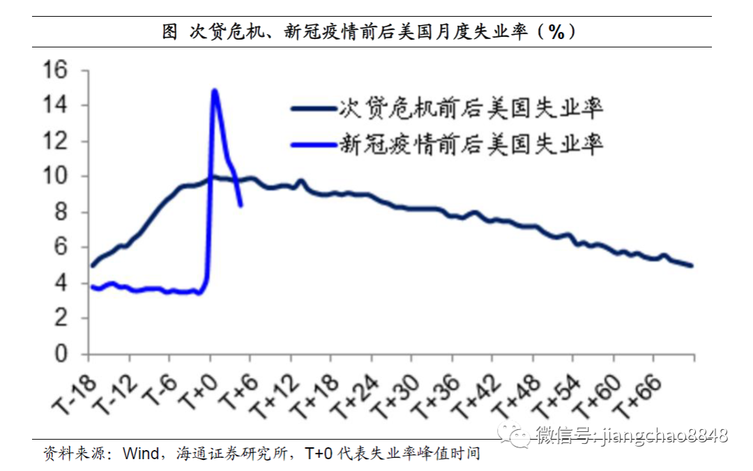 因此,这一次美国失业率的表现和08年金融危机前后完全不同。在08年金融危机时期,美国失业率经历了前期缓慢上升、以及后期更加缓慢的下降;其失业率从5%左右的自然失业率升至10%的最高点用了1年半时间,而从10%降回5%则花了差不多6年时间。但这一次美国失业率只用了两个月时间就从3.5%升至14.3%,而目前仅用了4个月时间失业率就降回8.4%。
