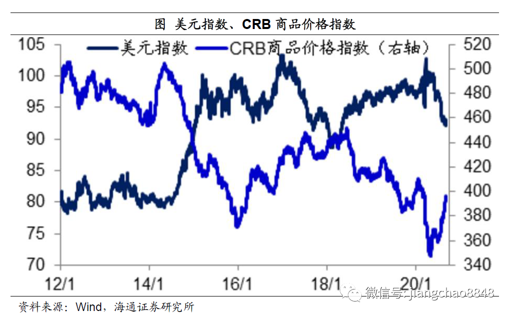 而商品价格的反弹也受到美元走弱的支撑,过去几年商品价格和美元之间也有非常明显的反向关系,美元走强拉动商品价格上涨的只有2016-17年的一小段时间,主要原因是当时中美经济同时复苏,叠加中国的供给侧改革,拉动了商品价格。