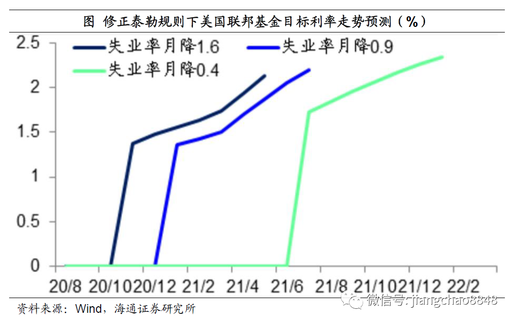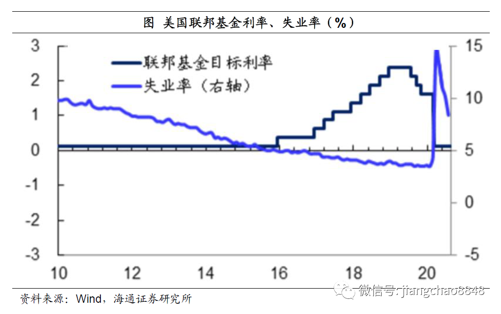 在今年6月份美联储发布的预测报告中,给出的预测是最早2022年之后才可能开始加息。问题在于,6月份美联储预测时使用的是5月份高达13.3%的失业率。我们即便参照1919年美国大流感的经验,根据失业率见顶之后每月下降0.4%的乐观假设,推算出来美联储最早也要在2022年以后才有可能加息,更不用说参照08年金融危机之后,按照失业率见顶之后每月下降0.1%的悲观假设,美联储要到2028年才有可能加息。