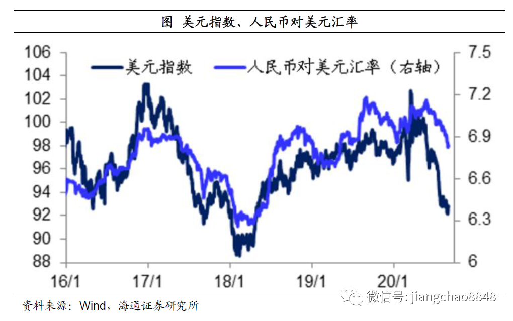 目前,人民币的走势是盯住一篮子货币并保持稳定,但由于其中最重要的货币是美元,因而美元指数对人民币对美元汇率有着重要影响,两者存在着高度的负相关性,往往在美元指数升值时,人民币对美元汇率走弱。而今年6月份以来人民币短期显著升值,主要的背景就是美元大幅贬值。