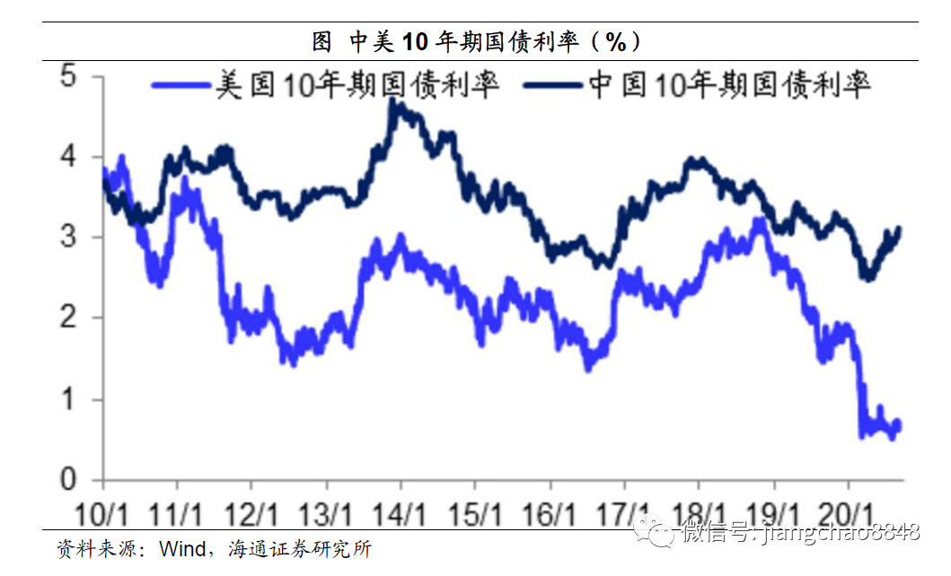 中美利差的扩大源于美国今年实施了超级宽松的货币政策,其10年期国债利率大幅下降至1%以下,而中国的10年期国债利率则是在4月份以后持续回升,目前已经回到了和年初相当的水平。但从过去10年的中美10年期国债利率走势来看,两者的运行趋势基本一致,而且在最近一轮周期中国明显领先于美国,中国10年期国债利率于17年末见顶回落,而10年期美债利率则是到18年末才见顶回落。