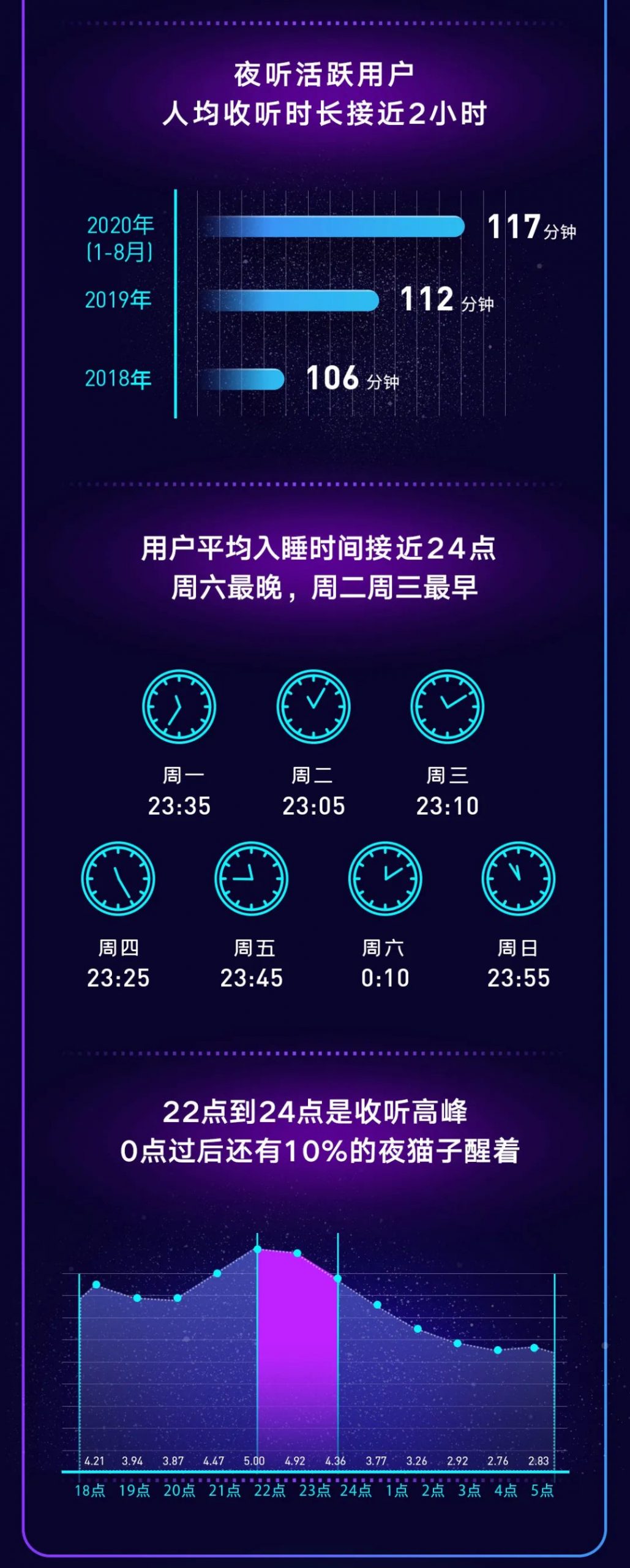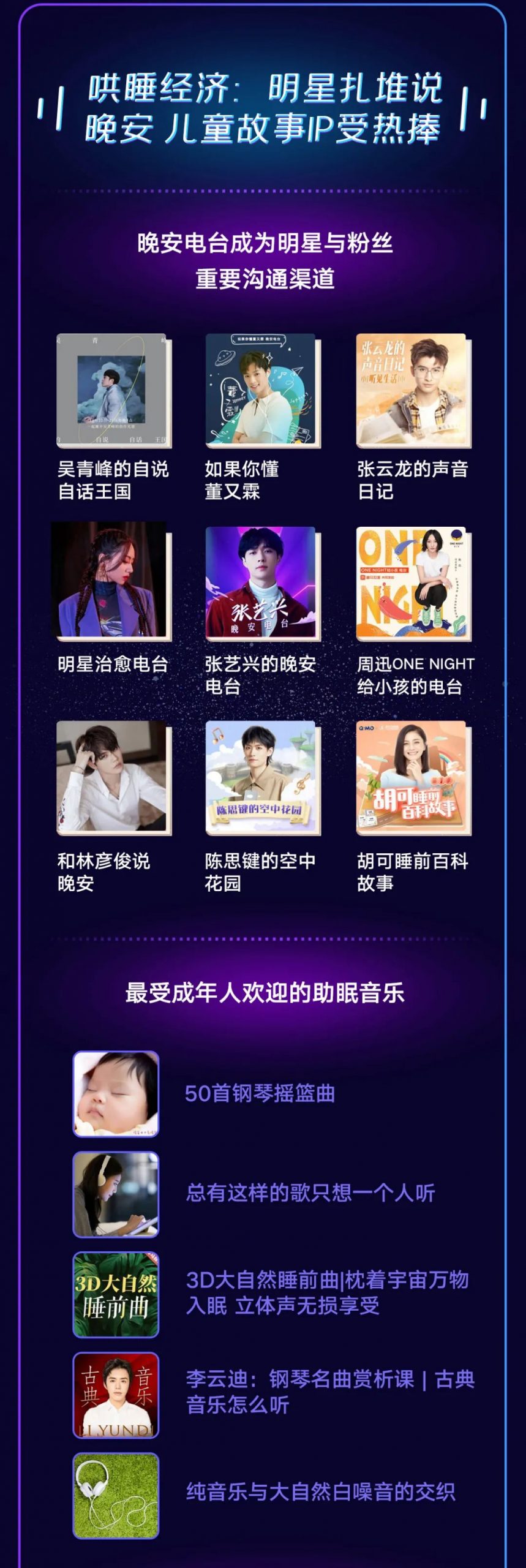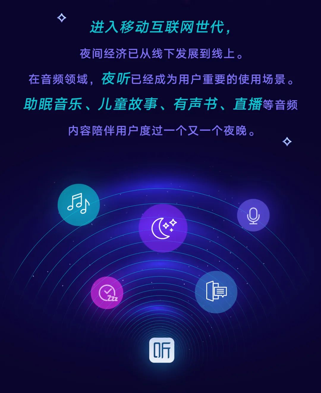 进入移动互联网时代,夜间经济已从线下发展到线上。在音频领域,夜听成为用户重要的使用场景。助眠音乐、儿童故事、有声书、直播等音频内容伴随用户度过一个又一个夜晚。