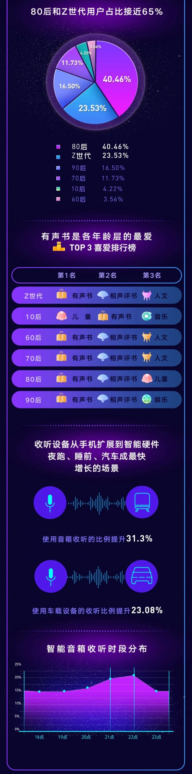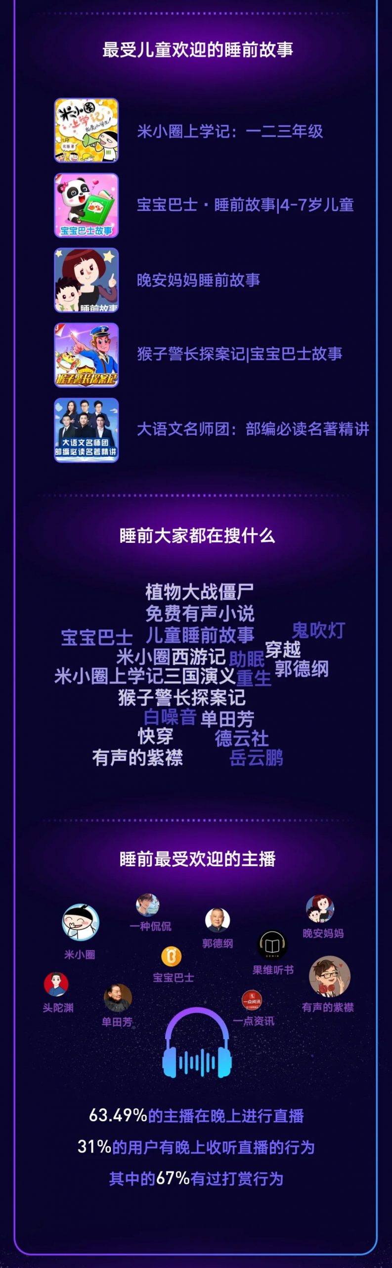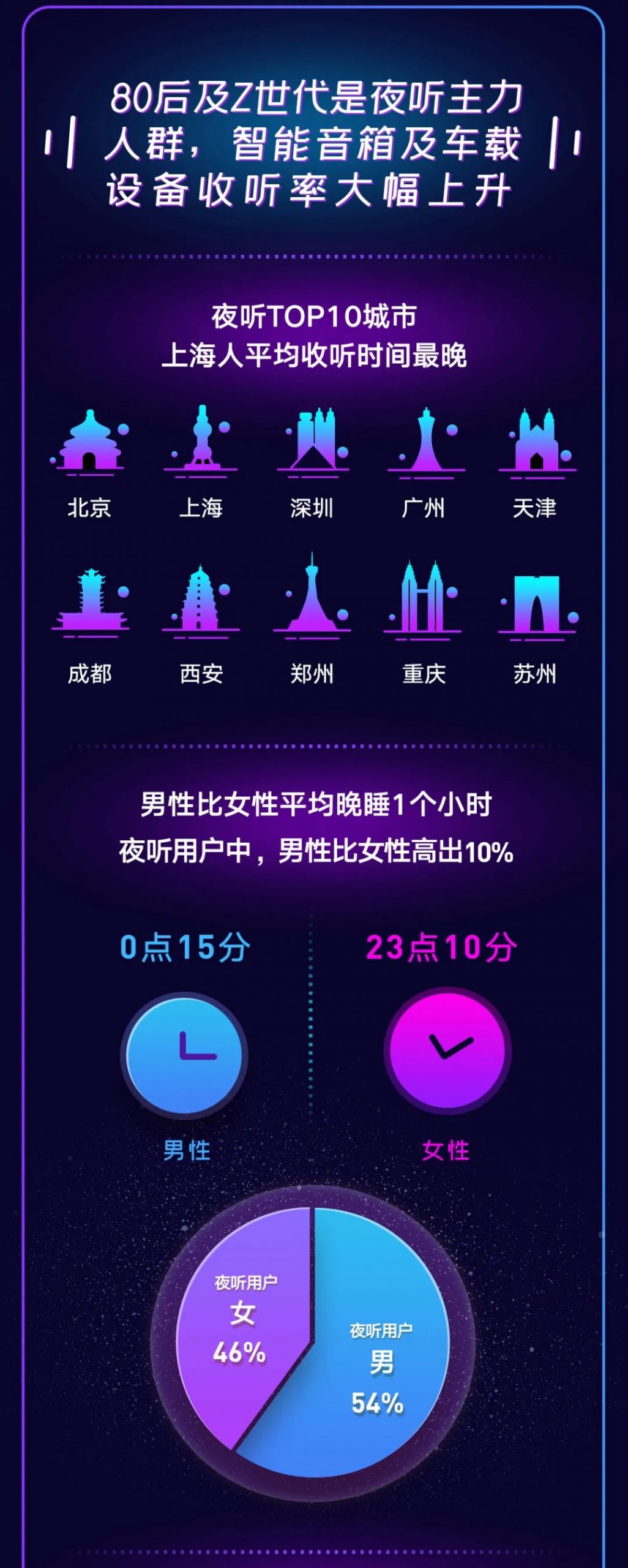 进入移动互联网时代,夜间经济已从线下发展到线上。在音频领域,夜听成为用户重要的使用场景。助眠音乐、儿童故事、有声书、直播等音频内容伴随用户度过一个又一个夜晚。