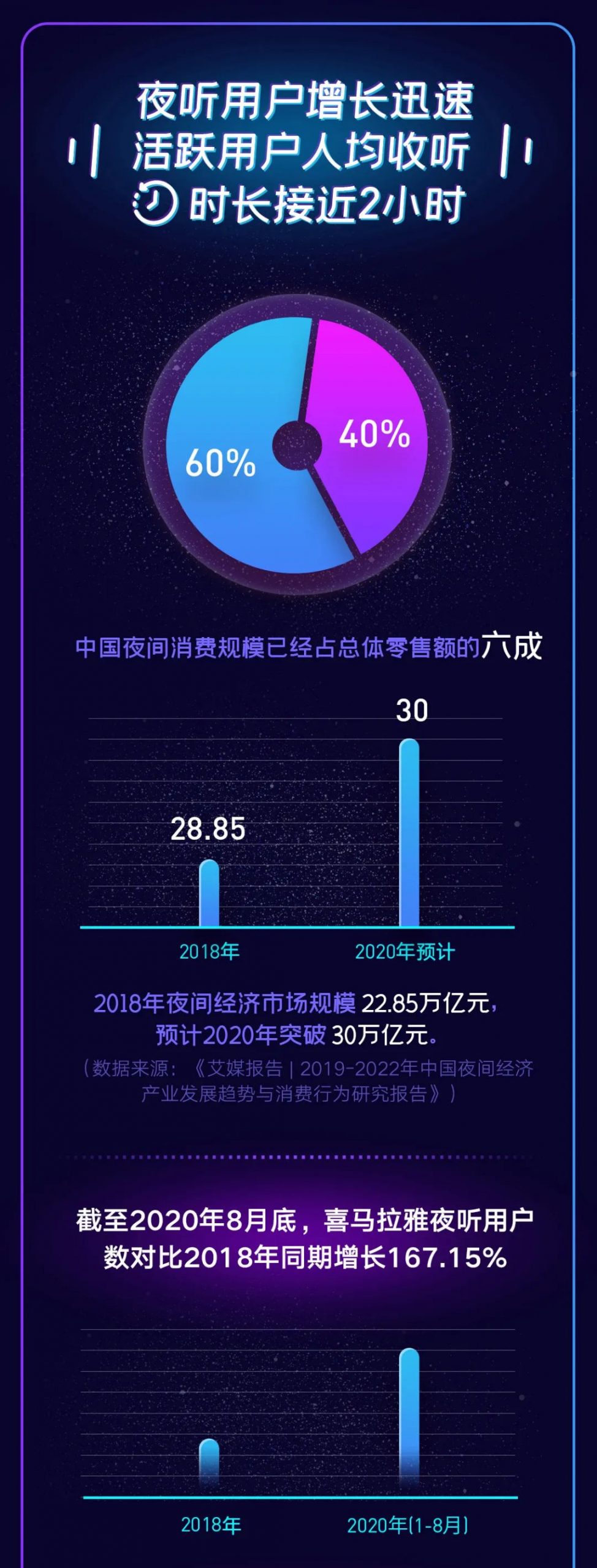 ○ 夜听用户增长迅速。截至2020年8月,喜马拉雅夜听用户相比2018年同期增长167.15%, 活跃用户人均收听时长接近2小时。