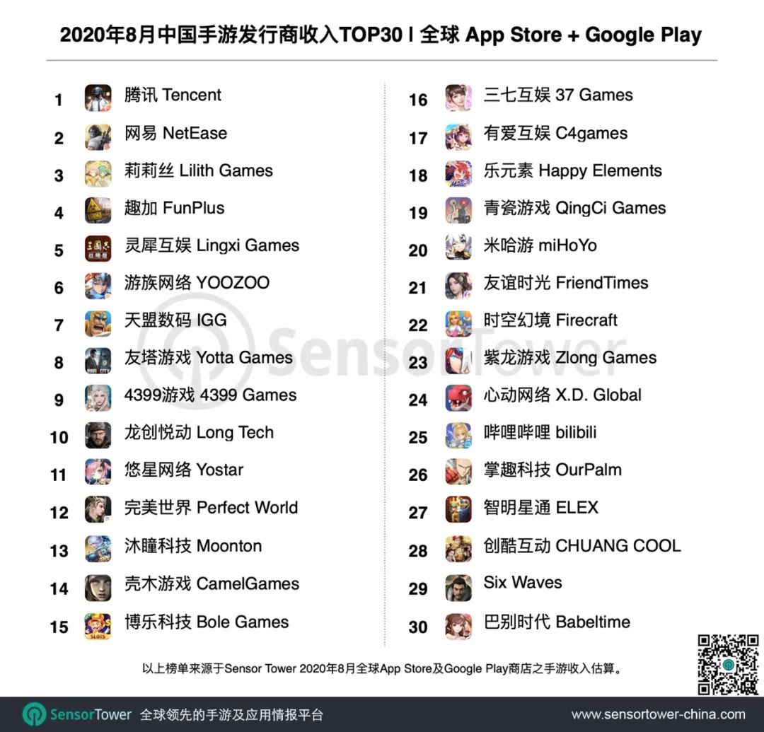 Sensor Tower商店情报平台显示,2020年8月中国手游发行商在全球 App Store 和 Google Play 的收入排名。榜单中30个手游发行商8月全球吸金18.6亿美元,占当期全球手游总收入27.3%。