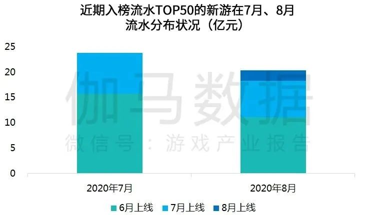 从近三个月各自入榜流水TOP50的新游在7、8月份的表现来看,6月新游数量保持不变,流水有所缩减,但仍是近三月上线新游中比例最高的,7月新游数量减少一款,流水略有缩减,8月新游表现欠佳,缺乏能进TOP20的高流水产品,首月流水破亿产品仅一款。
