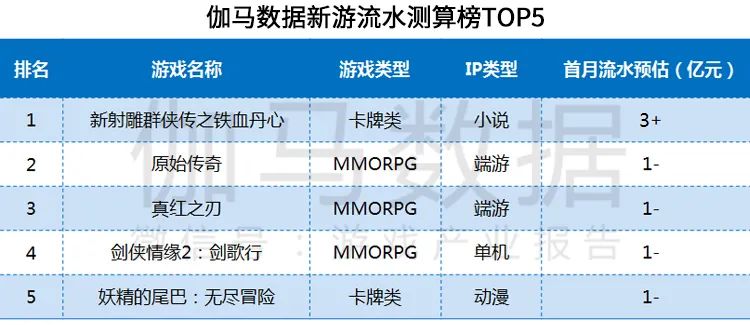 虽然8月新游戏整体表现不佳,但《新射雕群侠传之铁血丹心》一枝独秀,表现突出,该产品以金庸小说为背景改编,由中手游与狭义文化联合开发的卡牌类移动游戏,伽马数据预估首月流水超3亿元。