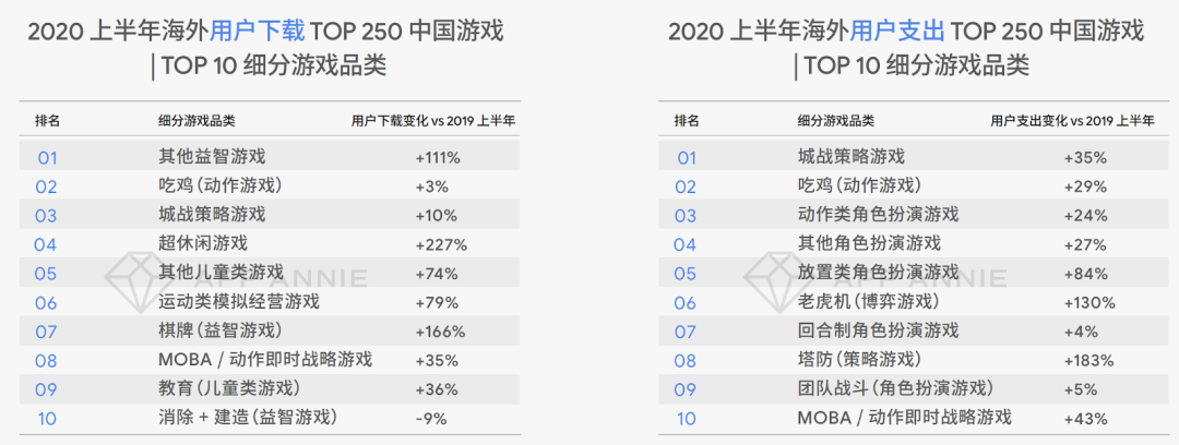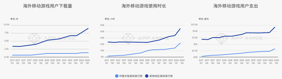 App Annie:2020 中国游戏出海驱动力 突如其来的 COVID-19,为人们的工作生活带来了巨大的挑战,但疫情下的封锁和社交隔离政策却为移动游戏行业带了巨大商机。 App Annie 与 Google 和 AppsFlyer 联合推出《2020 中国移动游戏出海驱动力报告》,深入分析全球手游市场。本报告主要内容: 出海现状及趋势 基于 Game IQ 的细分品类新机遇 游戏增长策略 洞察与建议 过去三年间,中国出海移动游戏持续成长,2020 上半年中国出海游戏使用时长增长率(+61%)和用户支出增长率(+37%)高于其他地区发行商的使用时长增长率(+55%)和用户支出增长率(+14%)。 基于 App Annie 革命性的 Game IQ 分类模型,通过对 2020 上半年海外用户下载和支出 TOP250 中国出海移动游戏分析,吃鸡游戏、城市战斗和 MOBA/动作即时战略游戏的用户下载表现十分亮眼;在用户支出方面,城市战斗、吃鸡游戏和动作角色扮演类游戏表现出了超强的吸金能力。 更多阅读:App Annie:2020 年上半年角色扮演游戏、博彩游戏前十强App Annie:2020年第三季度日本市场游戏下载十强(3款中国游戏上榜)App Annie:2020年移动市场年终盘点App Annie:2020年9月全球热门游戏及应用Top 10排行榜App Annie :2020 年第二季度全球移动游戏指数排行榜App Annie:2020 后疫情时代游戏行业观察App Annie:2021年2月中国厂商及应用出海收入30强App Annie:2018年12月发行商出海收入排行榜App Annie :2019 年主要移动游戏趋势探讨App Annie:详解最新日本手游市场趋势手游市场:2019 年稳健增长App Annie:2020年第一季度中国出海游戏收入排行榜App Annie :2020 年 9 月中国厂商及应用出海收入 30 强App Annie:2020年第1季度全球游戏指数排行榜App Annie:2021 年 11 月中国非游戏厂商及应用出海收入 30 强