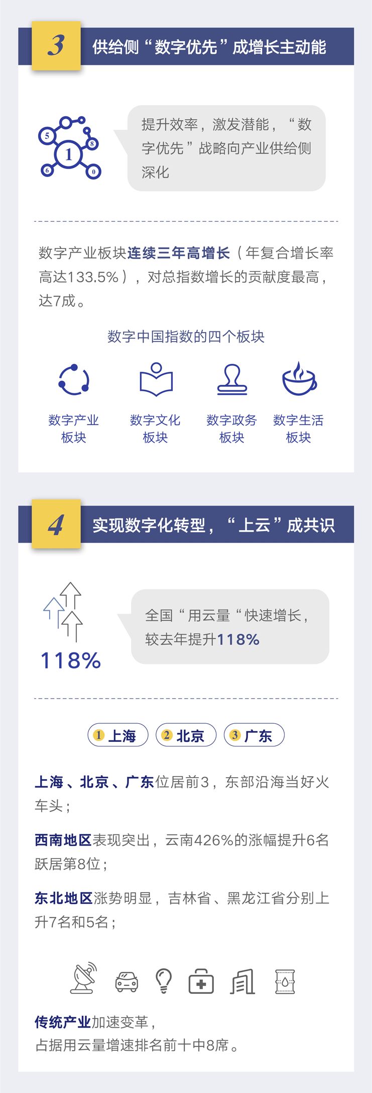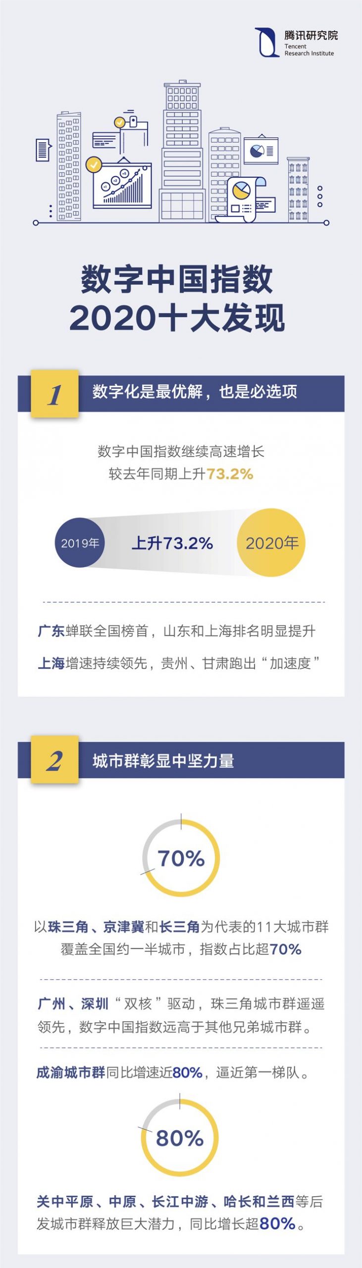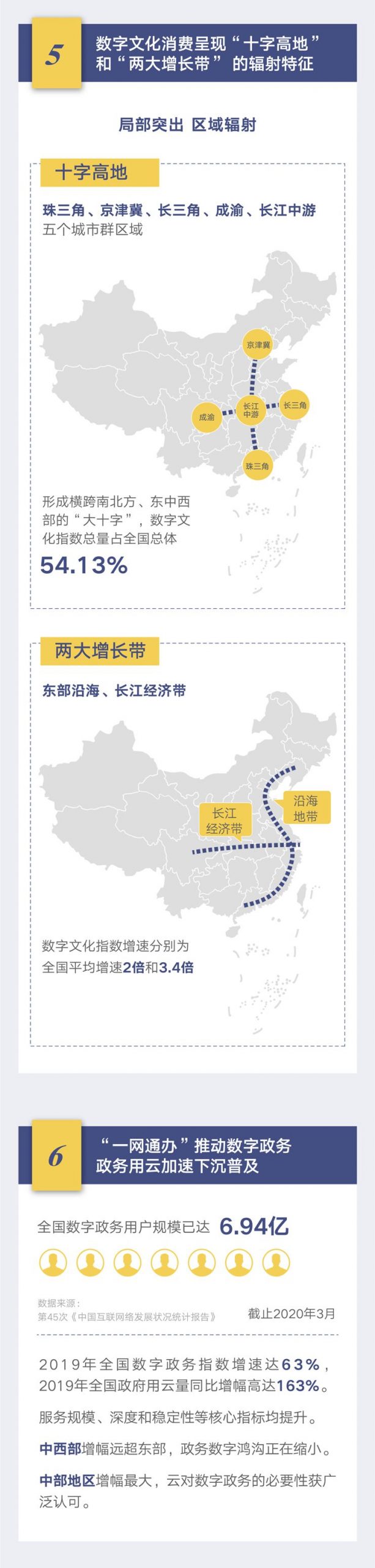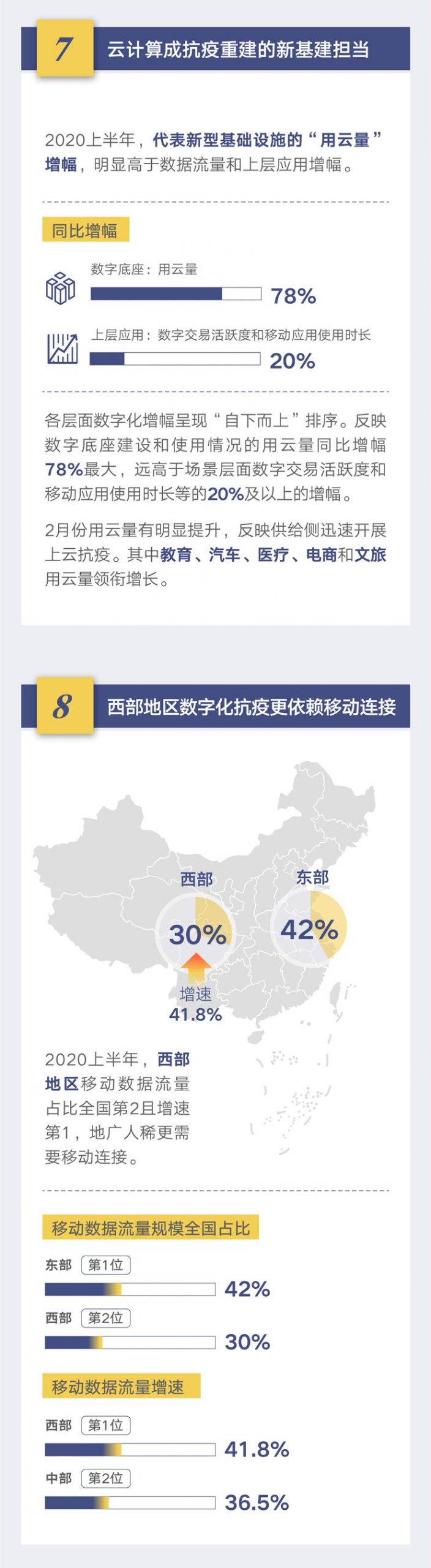 此次发布的报告显示:2019年数字中国指数继续保持高速增长,其中,以珠三角、京津冀和长三角为代表的11大城市群是推动我国数字化进程的中坚力量。此外,2019年全国用云量实现了118%的增长,2020年上半年各月份的用云量均明显高于去年同期,并且传统产业增速尤为明显。