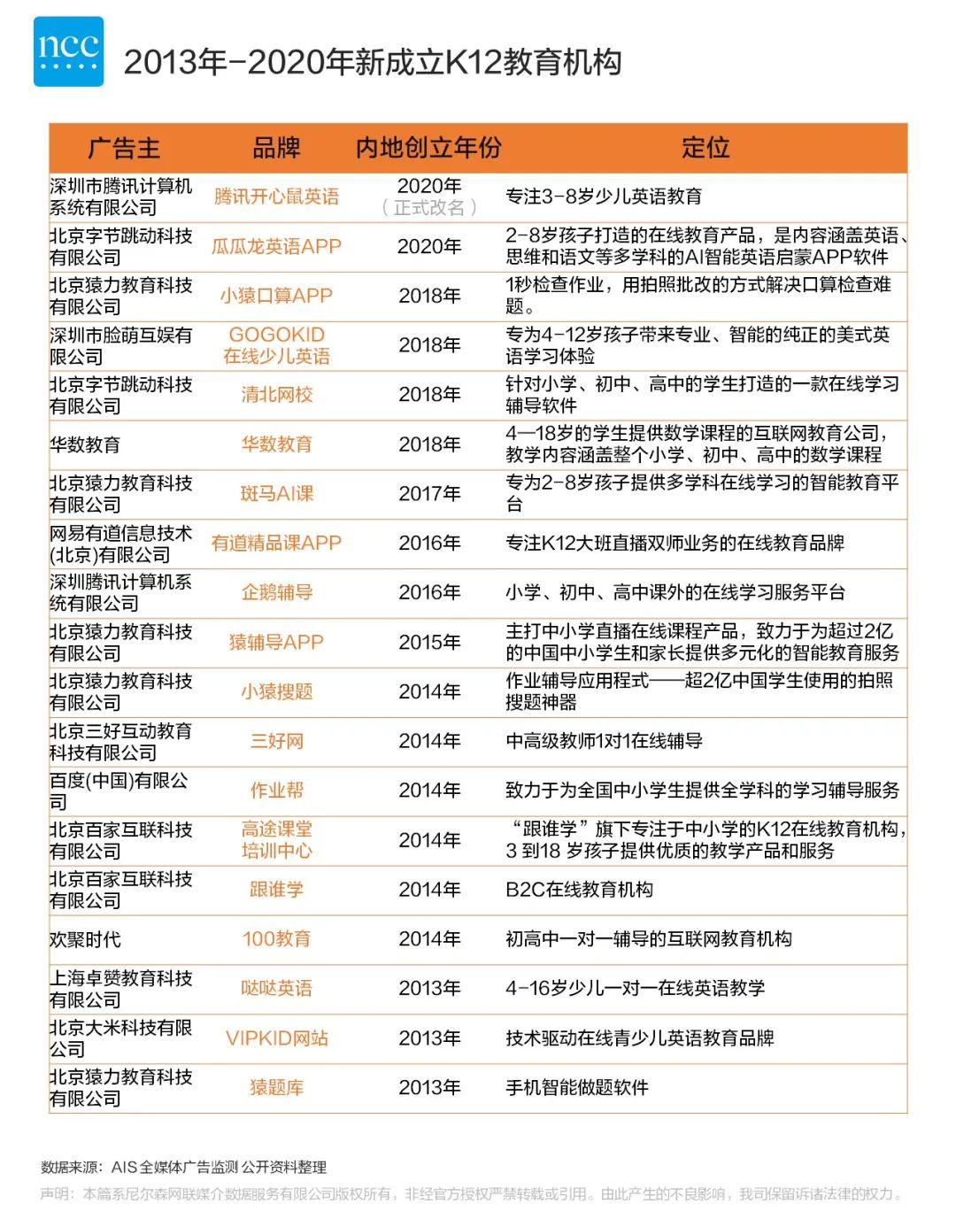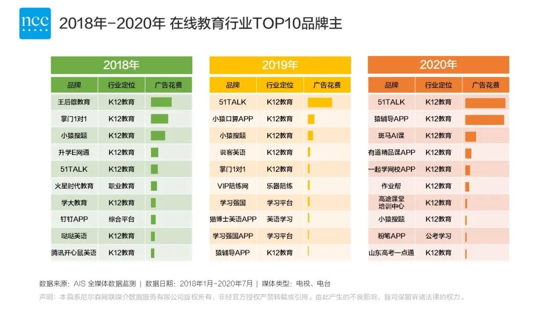 从2018年到2020年TOP10品牌主来看,广告花费投放排位变动活跃,一定程度上反映了在线教育仍属于行业探索时期。在这个阶段,K12教育仍是教育品牌竞争最为激烈的主赛道,2020年TOP10中共有8位品牌主便是该赛道下的重度玩家。