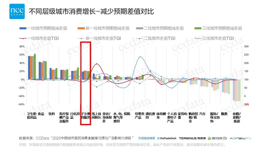 根据CCData“2020中国城市居民消费者触媒习惯与广告影响力调研”显示,疫情之后,在家庭收入不稳定性增加以及全民健康理念高涨的情况下,家庭消费观念与消费结构发生变化,更偏重于生活基础性项目和健康卫生类项目消费。而值得注意的是,家庭消费在子女教育服务项目上不仅仍然保持较高的支出预期,且不同层级城市的消费者对于子女教育的支出预期基本一致。