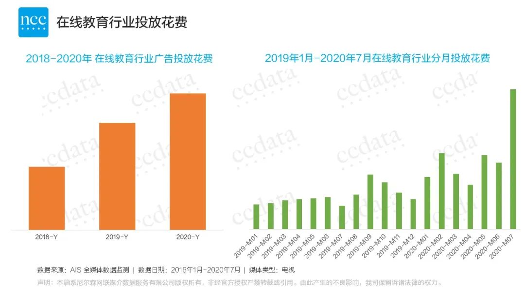 2018年到2019年,在线教育行业处于飞速发展阶段,电视广告投放刊例产生量级变化,这与电视广告触达到的家庭收视场景不无关系,尤其对于以家庭购买决策为主的K12教育(指“学前教育至高中教育”的基础教育)来说,父母是购买决策者,而孩子是服务体验者,家庭收视场景能够有效重叠两者,促进购买意愿的产生或实际购买行为的达成。2020年疫情刺激之下,前7月的电视广告投放数据大大超过2019年全年总花费,而且与2019年7月在线教育投放出现小低谷相比,2020年7月暑期档的广告投放则呈现井喷之势。
