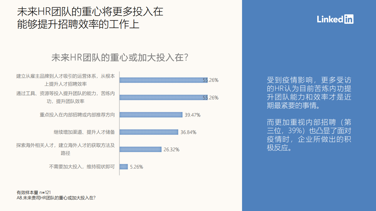未来HR团队的重心将更多投入在能够提升招聘效率的工作上。受到疫情影响,更多受访的HR认为目前苦炼内功提升团队能力和效率才是近期最紧要的事情。而更加重视内部招聘(第三位,39%)也凸显了面对疫情时,企业所做出的积极反应。
