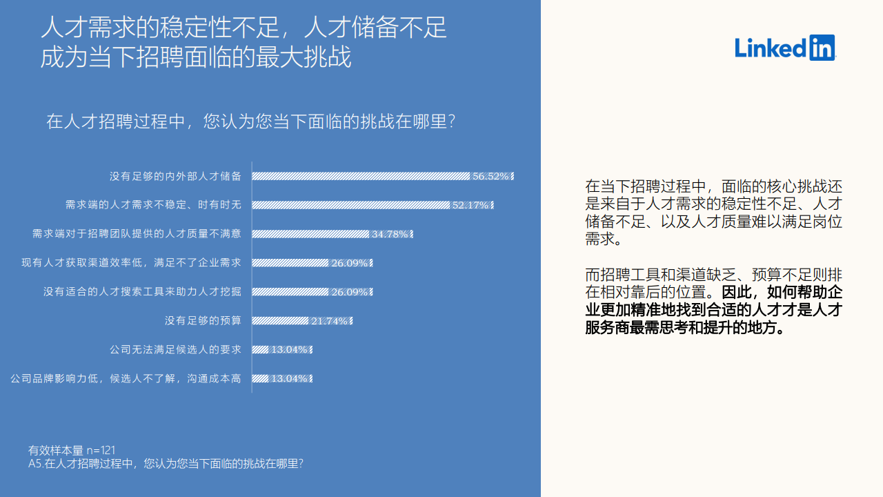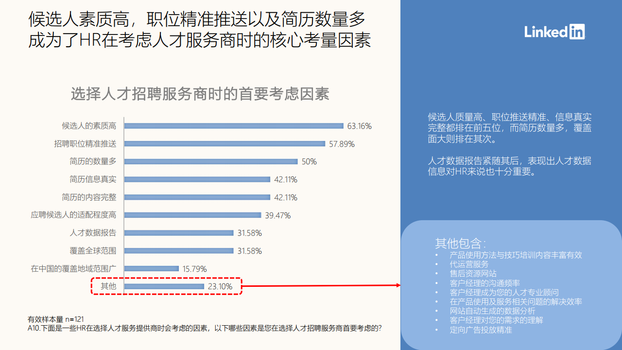 第二、HR在选择平台的原因方面则更加侧重质量,其次是简历数量。因此候选人质量高、职位推送精准、信息真实完整这些都排在服务平台选择的前五位。