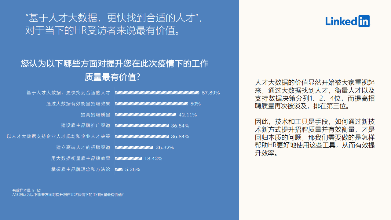 第四、人才大数据的价值显然开始被大家重视起来,通过大数据找到人才,衡量人才以及支持数据决策成为疫情下提升工作质量最有价值的工作,而提高招聘质量再次被谈及,排在第三位。