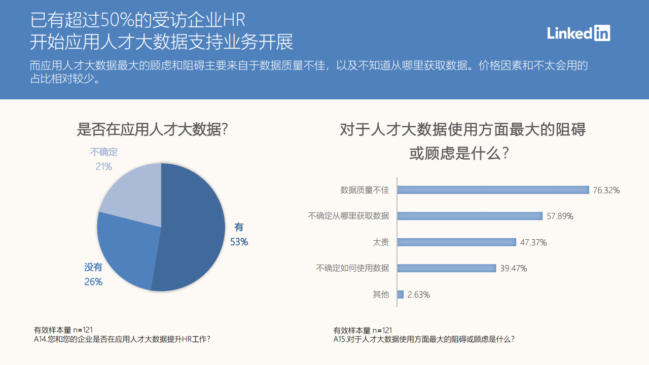 当前表示在工作中应用人才大数据的HR的占比仅占到50%。而应用人才大数据最大的顾虑和阻碍主要来自于数据质量不佳,以及不知道从哪里获取数据。
