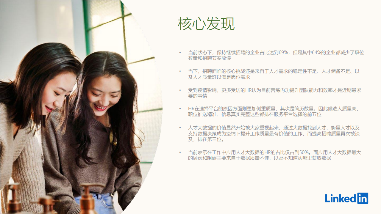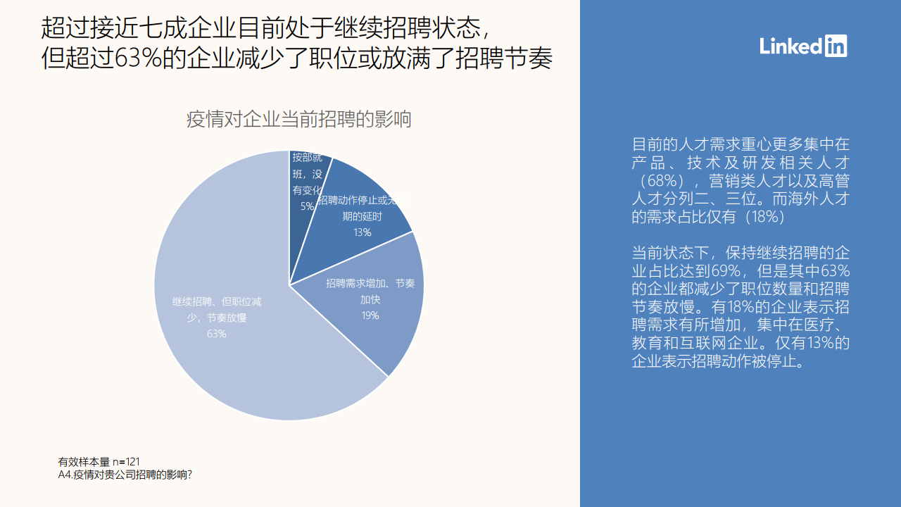 第一、当前状态下,保持继续招聘的企业占比达到69%,但是其中64%的企业都减少了职位数量和招聘节奏放慢。