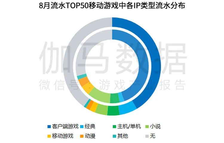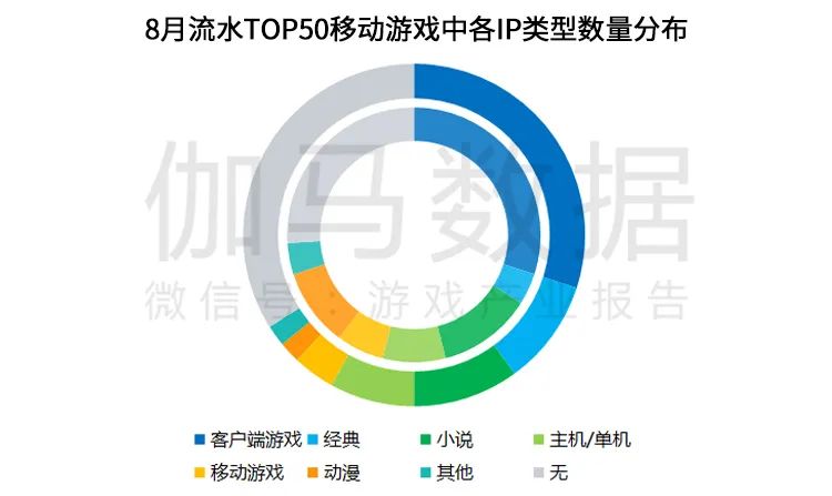 2020年8月,流水TOP50移动游戏中,IP改编产品流水和数量占比均较去年有所下滑,IP产品流水占比不足六成,小说IP流水占比降幅最大。虽然在TOP50产品中小说IP数量占比变化不大,但流水下降较多,目前小说IP改编移动游戏仍然面临着困境,在长线运营上表现不足,未来需从玩法入手,提升改编产品的持续可玩性。