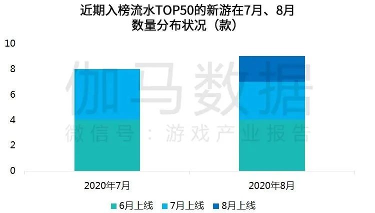 从近三个月各自入榜流水TOP50的新游在7、8月份的表现来看,6月新游数量保持不变,流水有所缩减,但仍是近三月上线新游中比例最高的,7月新游数量减少一款,流水略有缩减,8月新游表现欠佳,缺乏能进TOP20的高流水产品,首月流水破亿产品仅一款。