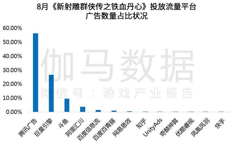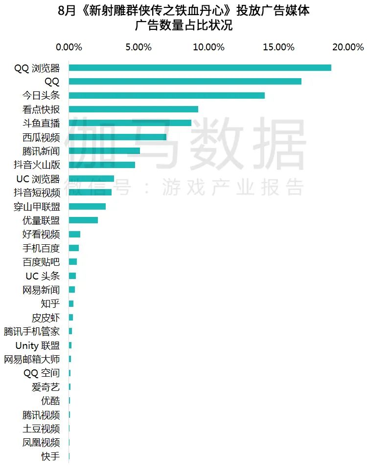 《新射雕群侠传之铁血丹心》上线仅12天便冲到8月新游榜第一,在多平台进行广告投放成为了产品快速获取用户的关键。《新射雕群侠传之铁血丹心》在13家流量平台进行了广告投放,广告媒体达到29家。其中腾讯广告平台数量占比56.4%,巨量引擎平台占比26.6%。QQ浏览器、QQ和今日头条三家媒体广告投放数量合计占比近5成,覆盖到了主要的互联网游戏用户。凭借IP的知名度和影响力,多渠道投放的策略使得产品快速触及到游戏用户,吸引用户下载与试玩。