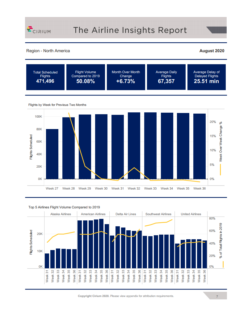 根据Cirium近日公布的《航空洞察报告》: 今年8月份,全球计划航班约184万个,为去年同期的53%,平均每日航班数大概26万个,平均航班延误时间接近38分钟。对比2019年同期数据,8月份航班数排名前五的航空公司是美国航空、中国东航、达美航空、西南航空和美联航,其中四家来自美国,一家来自中国。其中,从绝对值看,8月份表现最好的是达美航空;从同比复苏看,表现最好的是西南航空,在第36周的航班数已经接近去年同期的80%。