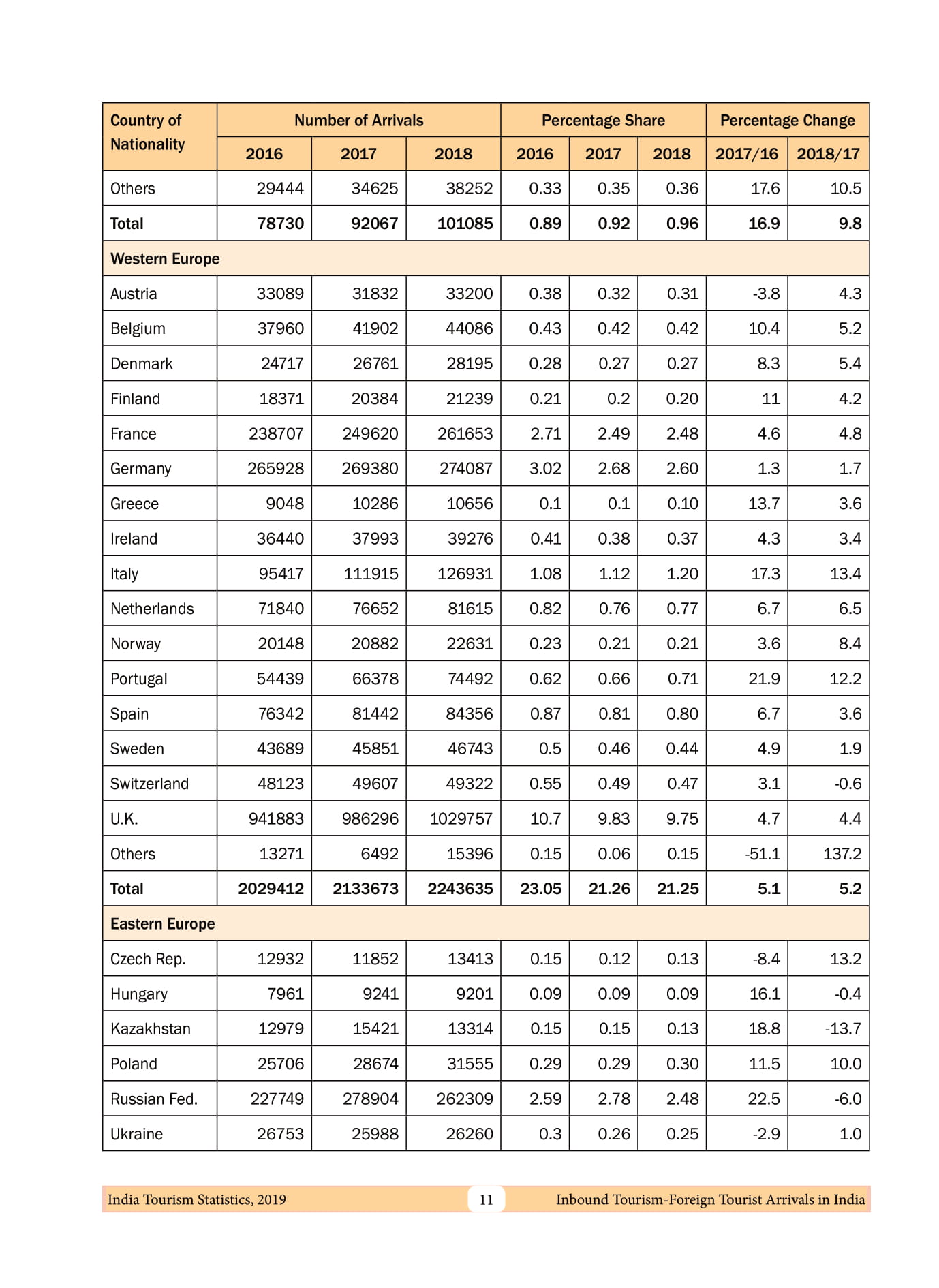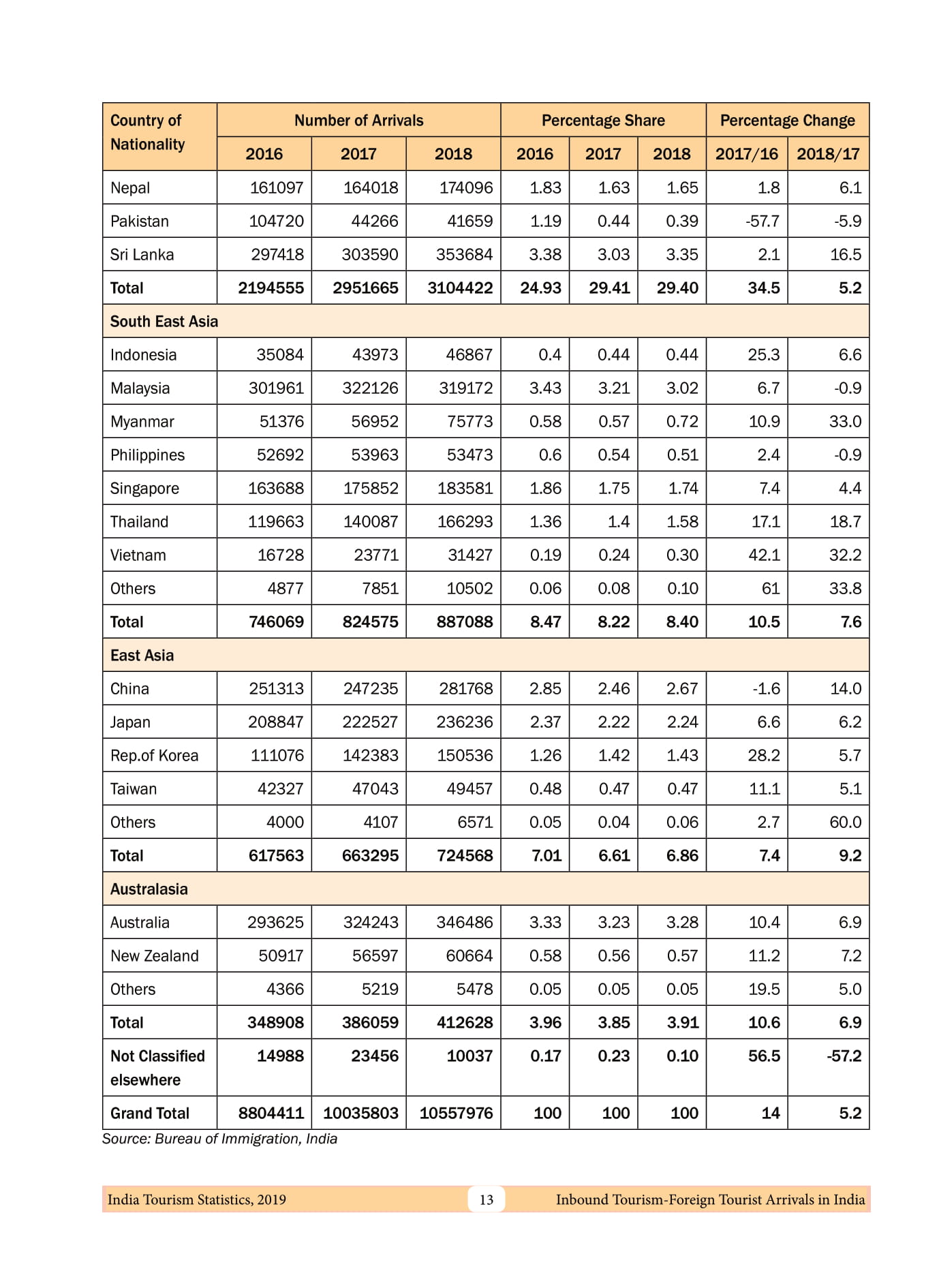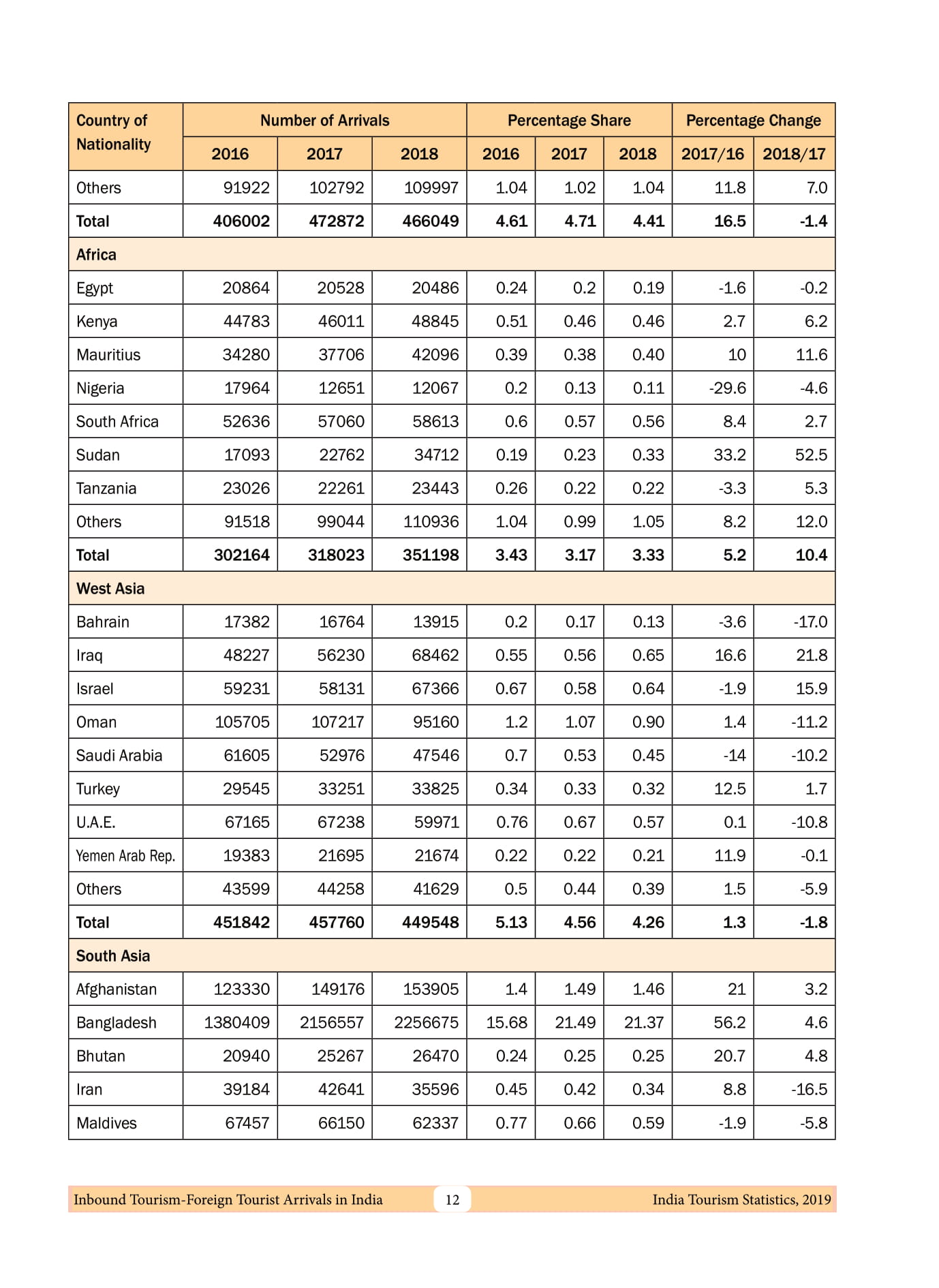 印度旅游部发布了“2019年印度旅游统计数据”。2018年,印度外国游客数量从2017年的1004万人次增加到1056万。2018年外国游客入境数量比2017年增长5.2%,2017年比2016年增长14.0%。