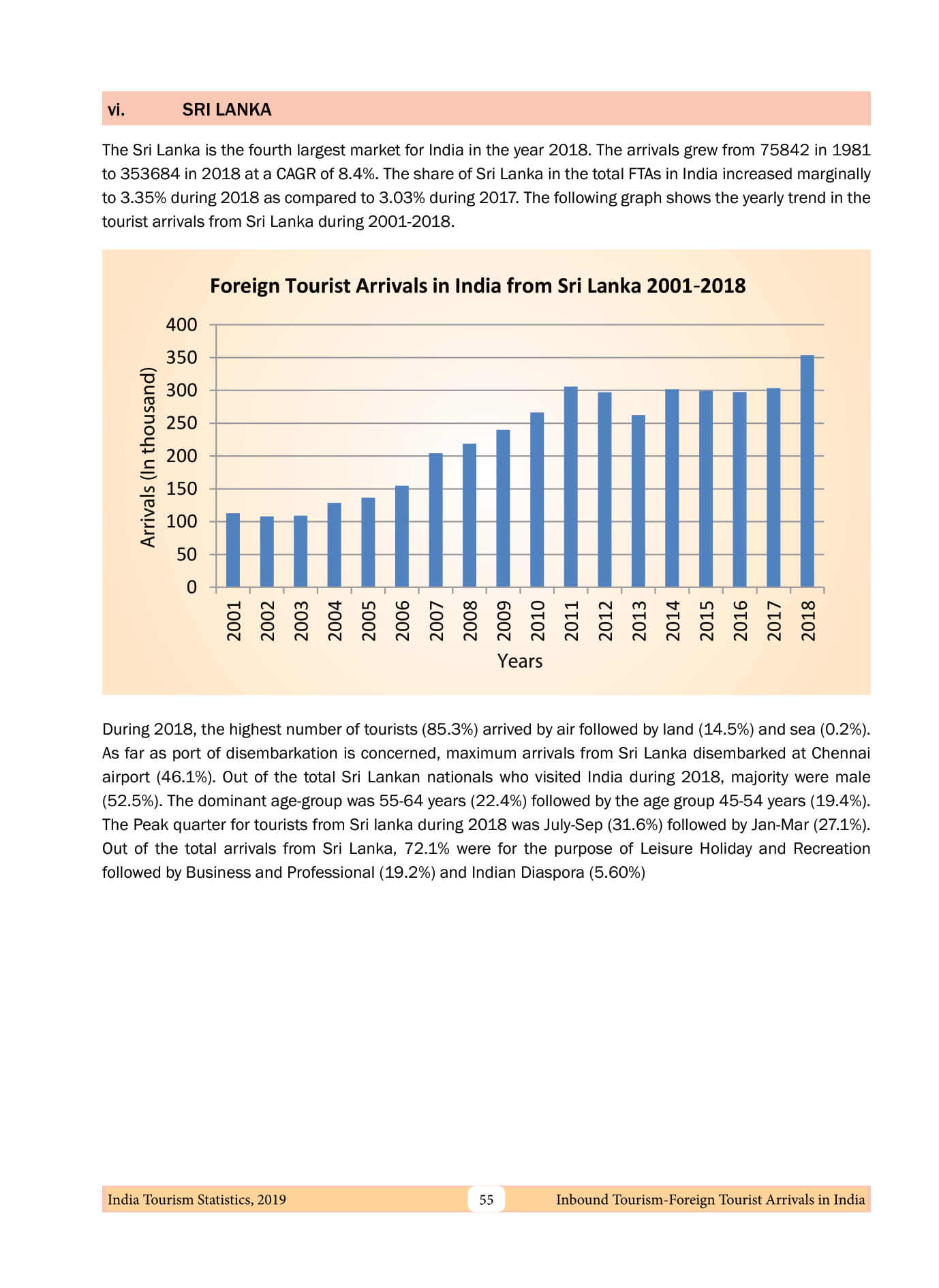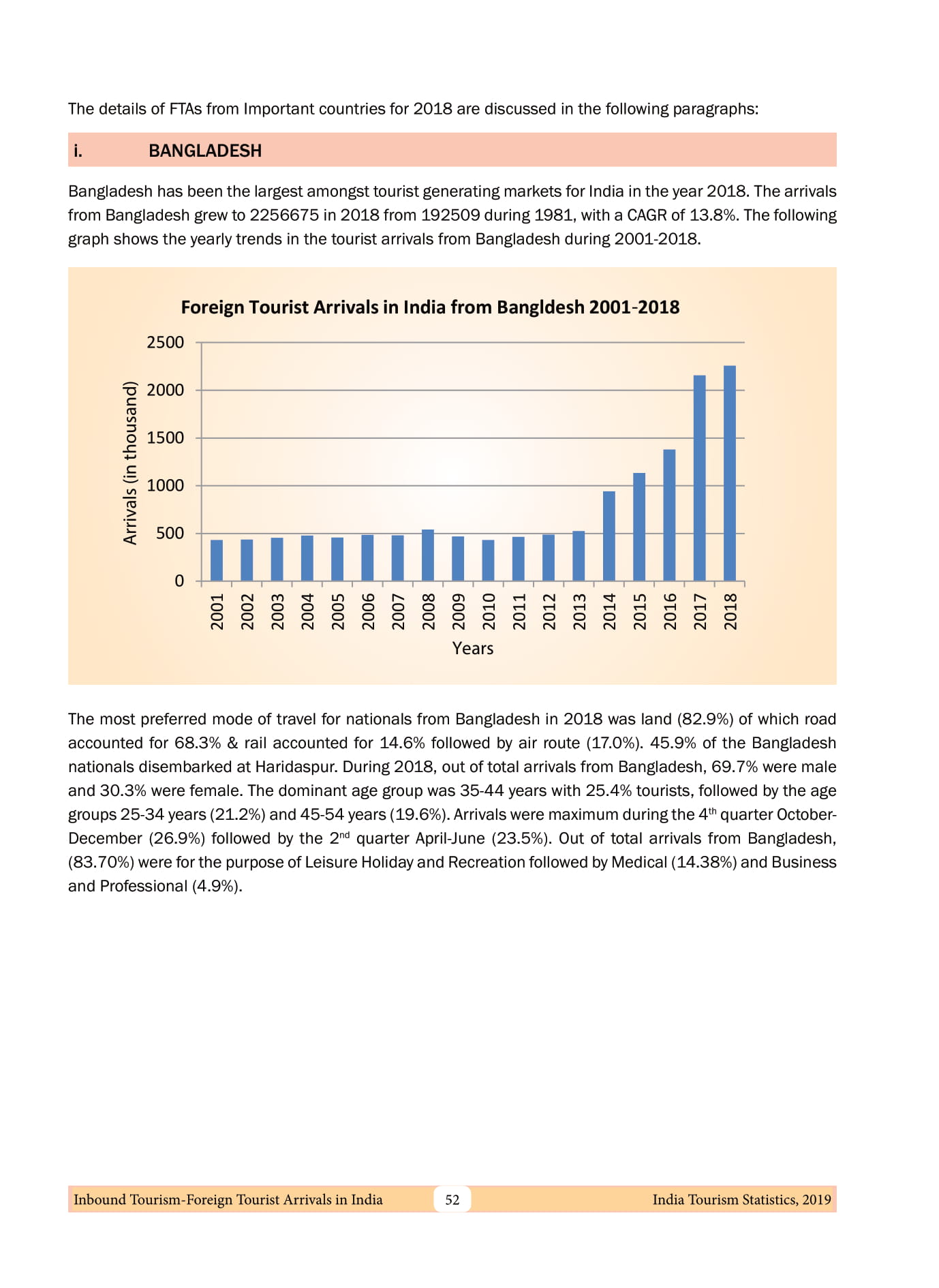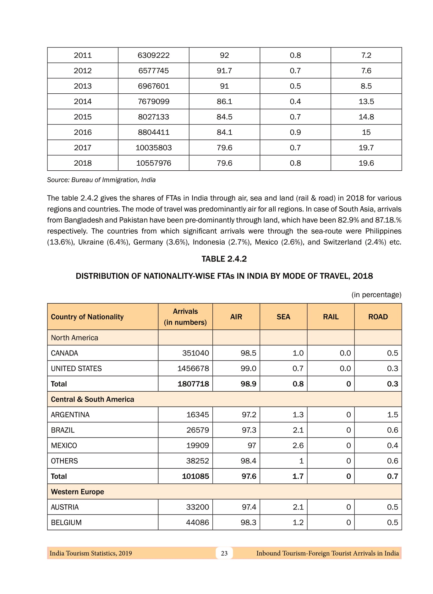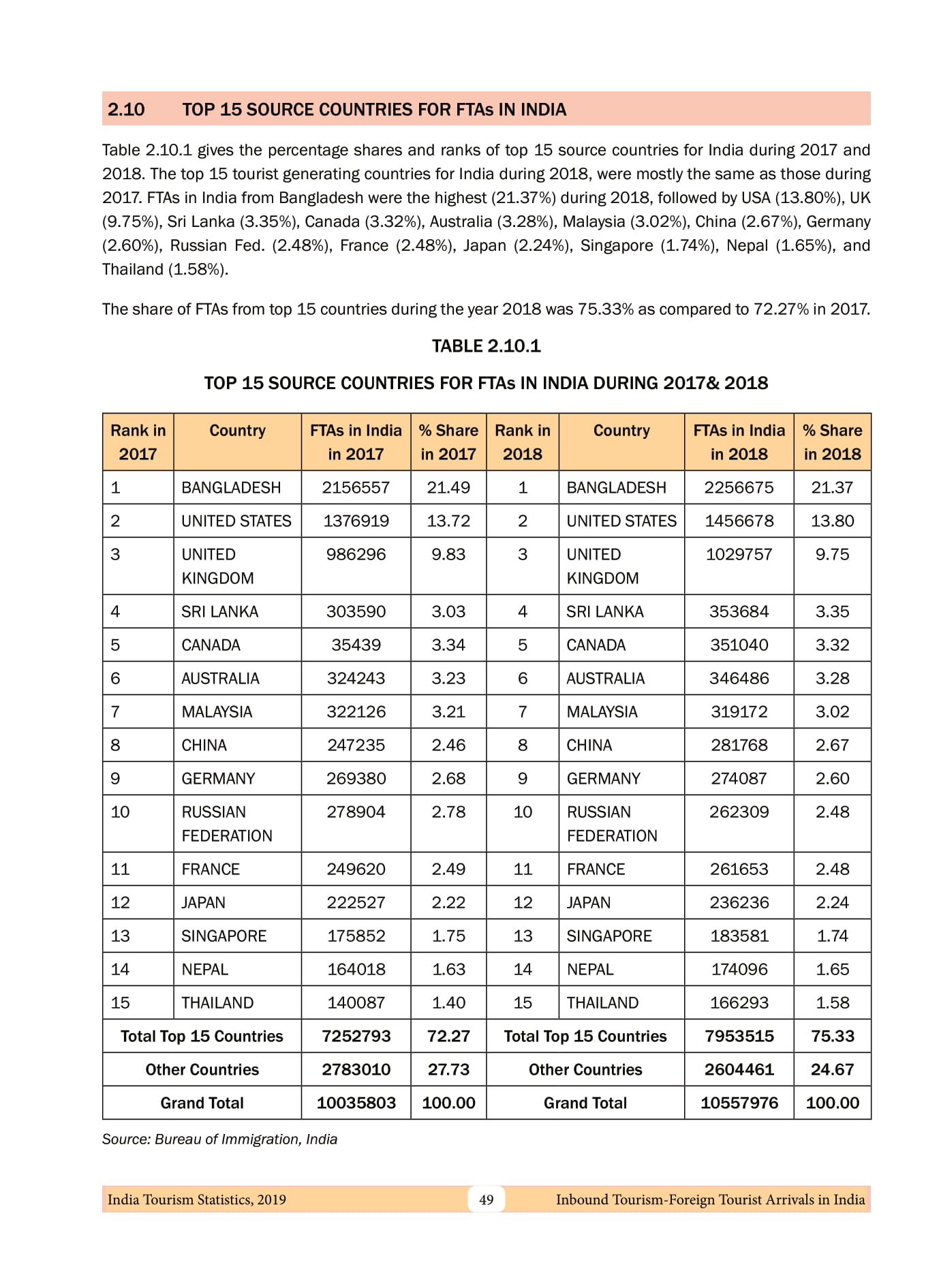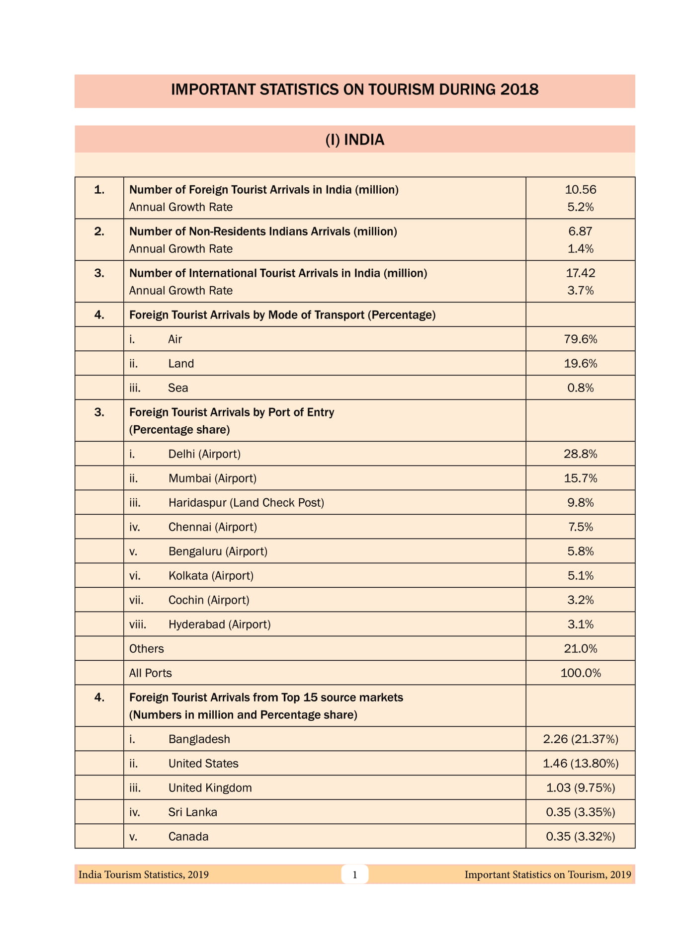 约79.6%的外国游客通过空中进入印度,其次是陆路(19.6%)和海路(0.8%)。德里和孟买机场约占印度外国游客总数的44.5%。2018年印度外国游客前15大来源地市场是孟加拉国,其次是美国、英国、斯里兰卡、加拿大、澳大利亚、马来西亚、中国、德国、俄罗斯、法国、日本、新加坡、尼泊尔和泰国。2018年,前15个国家约占印度外国游客总数的75.33%。