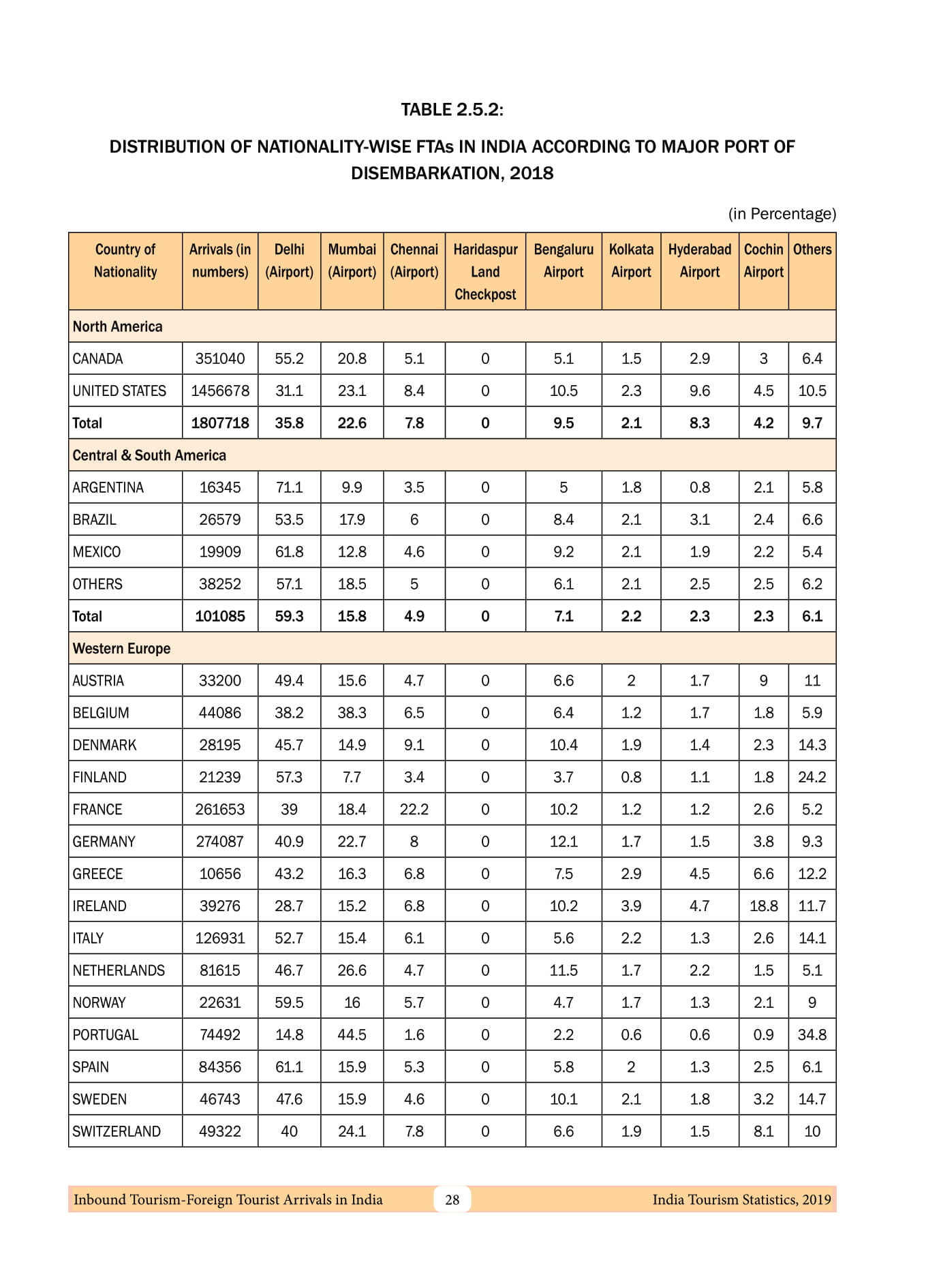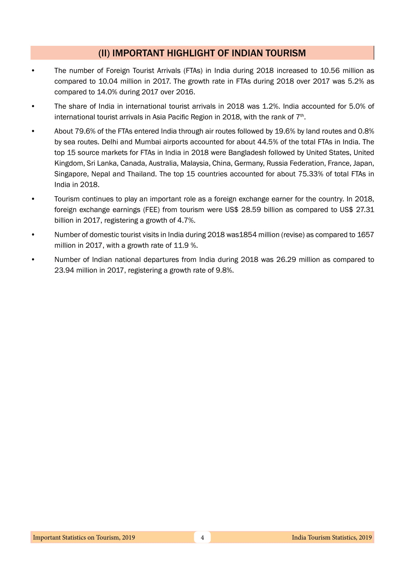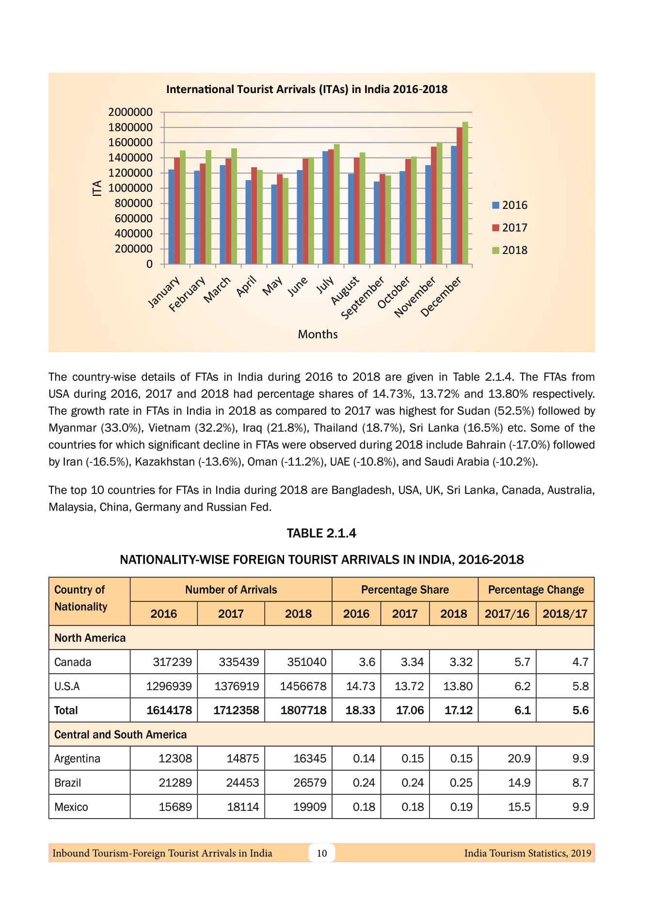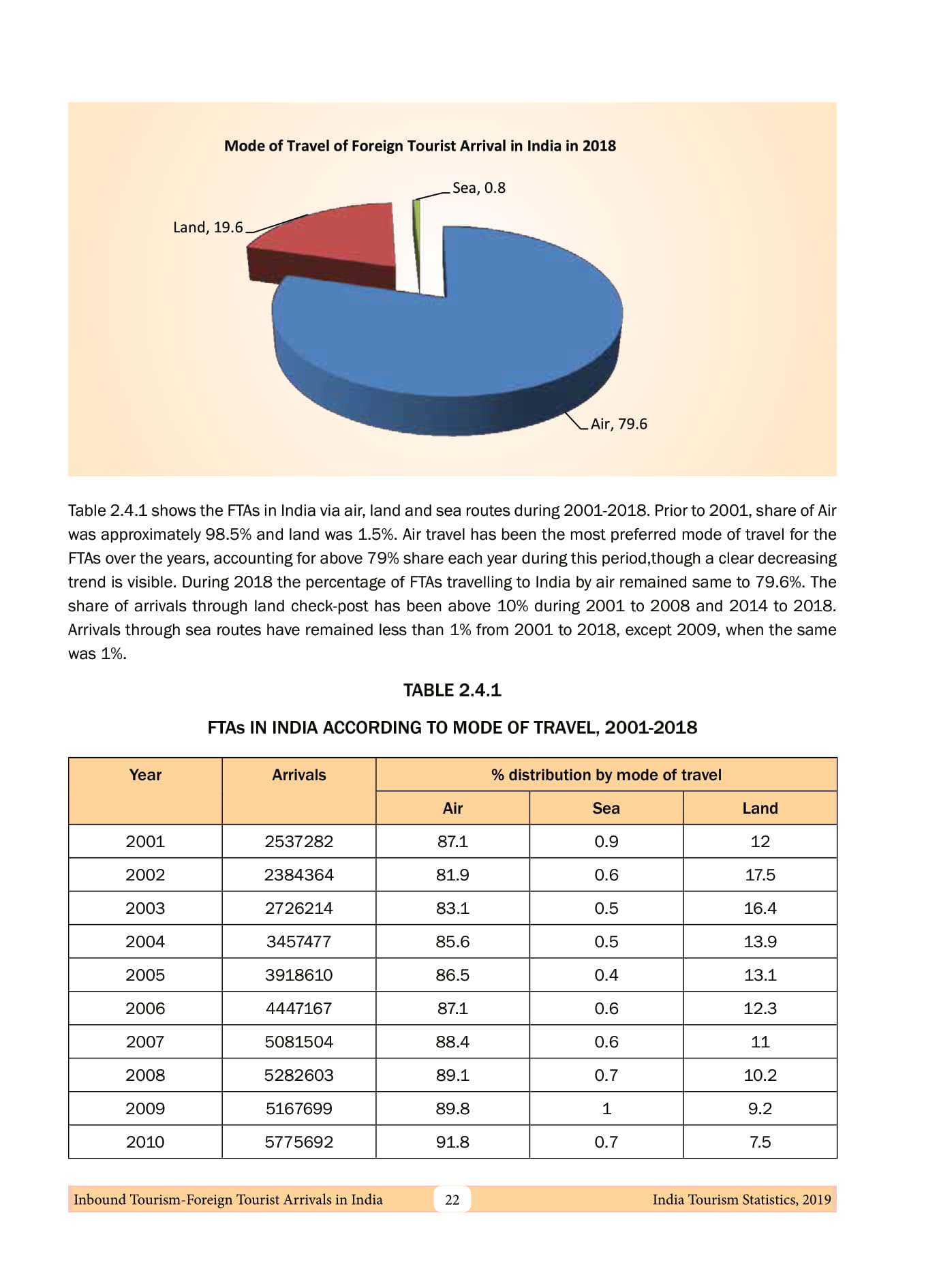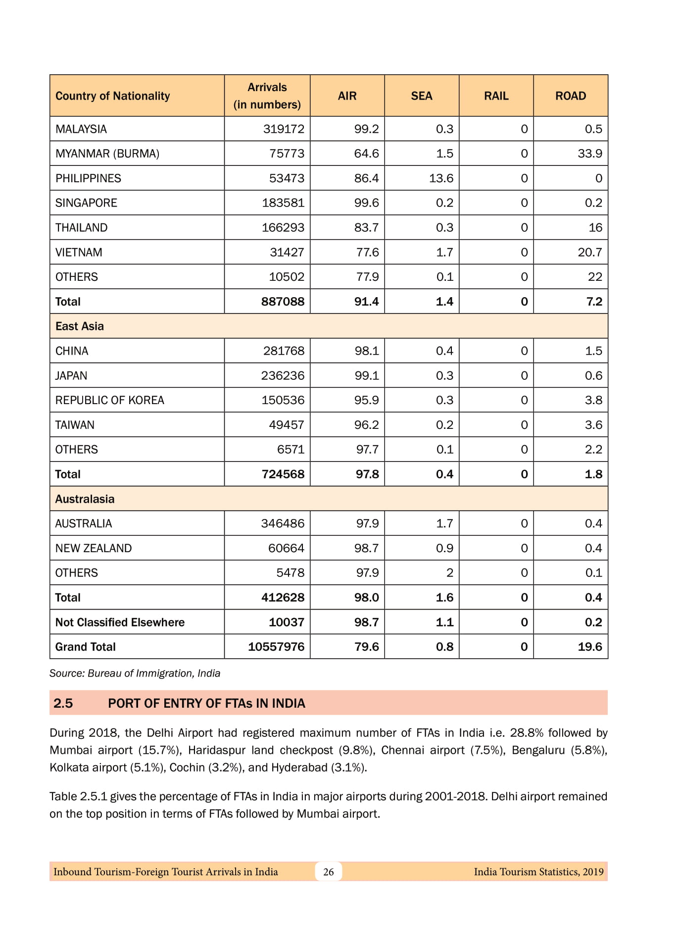 约79.6%的外国游客通过空中进入印度,其次是陆路(19.6%)和海路(0.8%)。德里和孟买机场约占印度外国游客总数的44.5%。2018年印度外国游客前15大来源地市场是孟加拉国,其次是美国、英国、斯里兰卡、加拿大、澳大利亚、马来西亚、中国、德国、俄罗斯、法国、日本、新加坡、尼泊尔和泰国。2018年,前15个国家约占印度外国游客总数的75.33%。