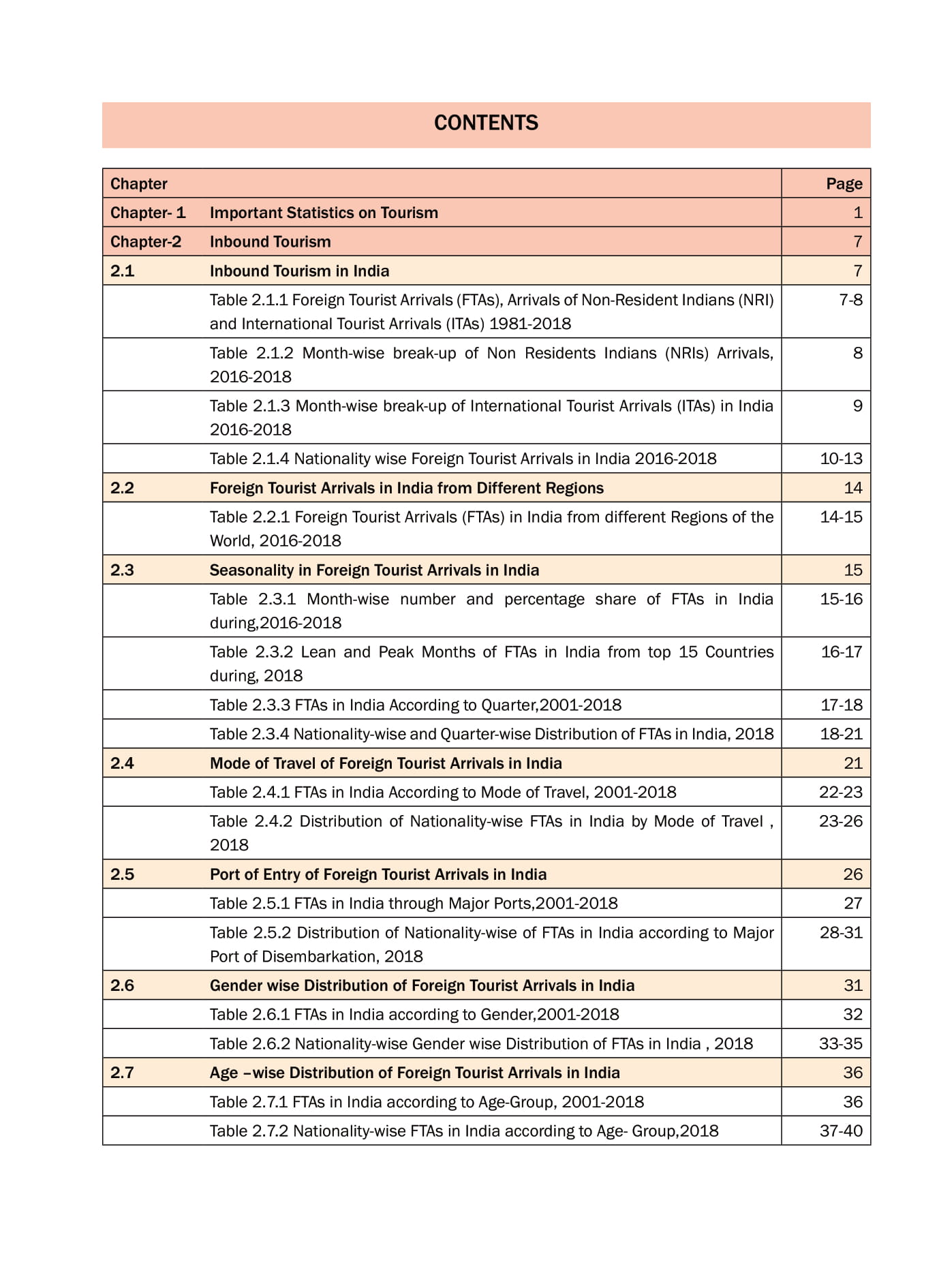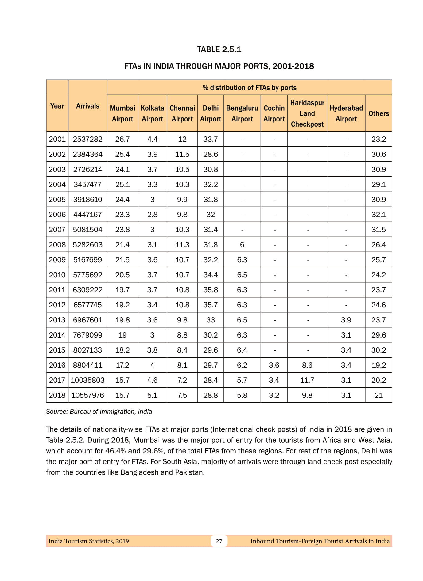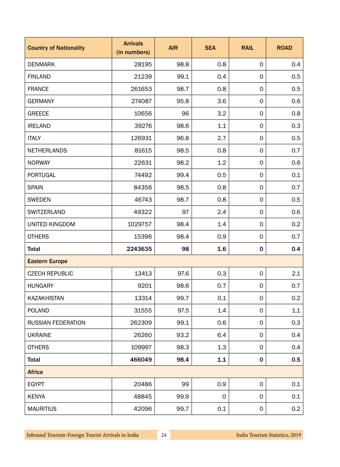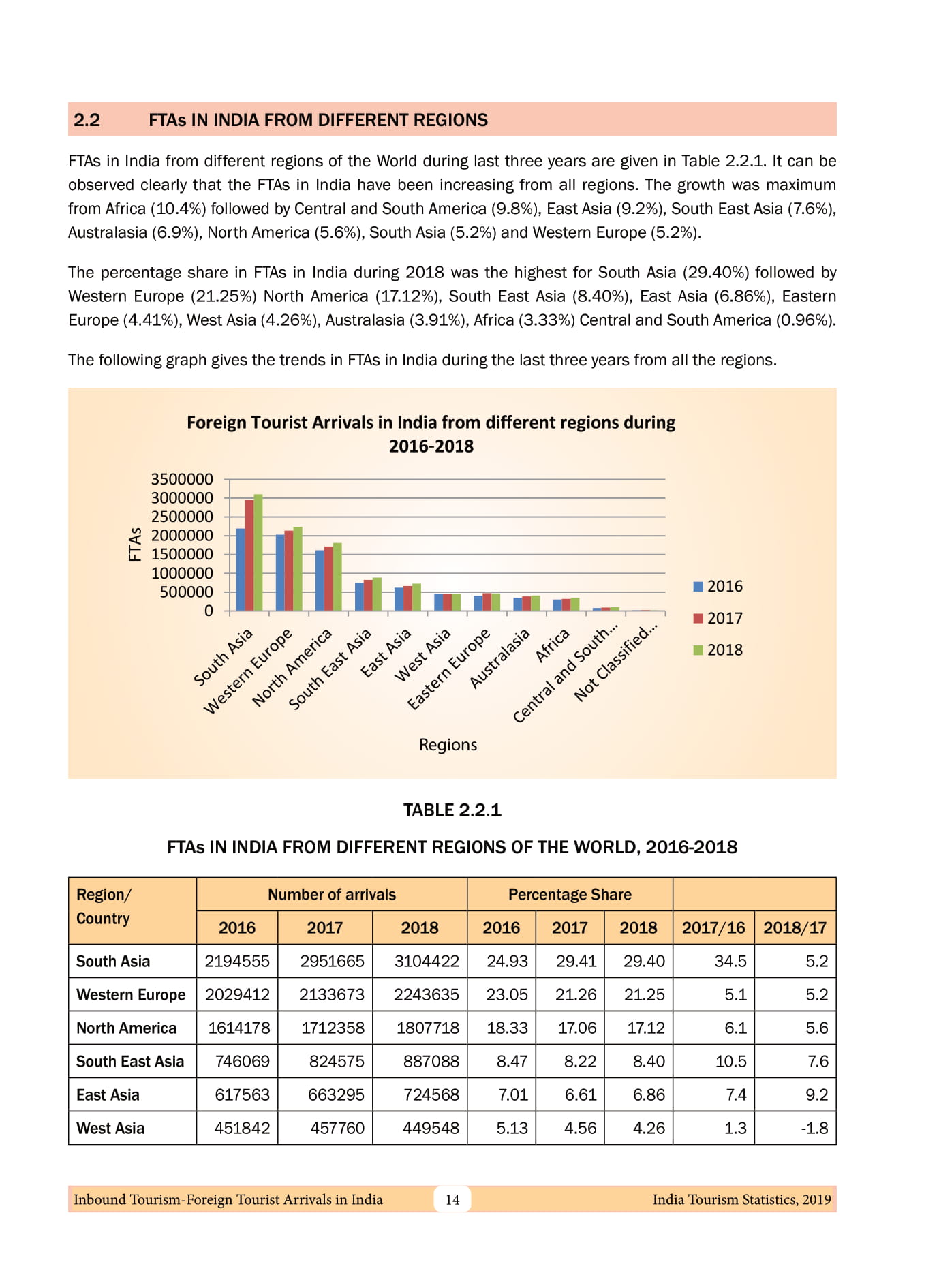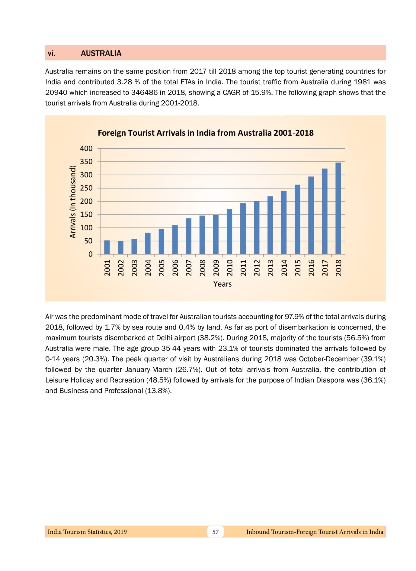 约79.6%的外国游客通过空中进入印度,其次是陆路(19.6%)和海路(0.8%)。德里和孟买机场约占印度外国游客总数的44.5%。2018年印度外国游客前15大来源地市场是孟加拉国,其次是美国、英国、斯里兰卡、加拿大、澳大利亚、马来西亚、中国、德国、俄罗斯、法国、日本、新加坡、尼泊尔和泰国。2018年,前15个国家约占印度外国游客总数的75.33%。