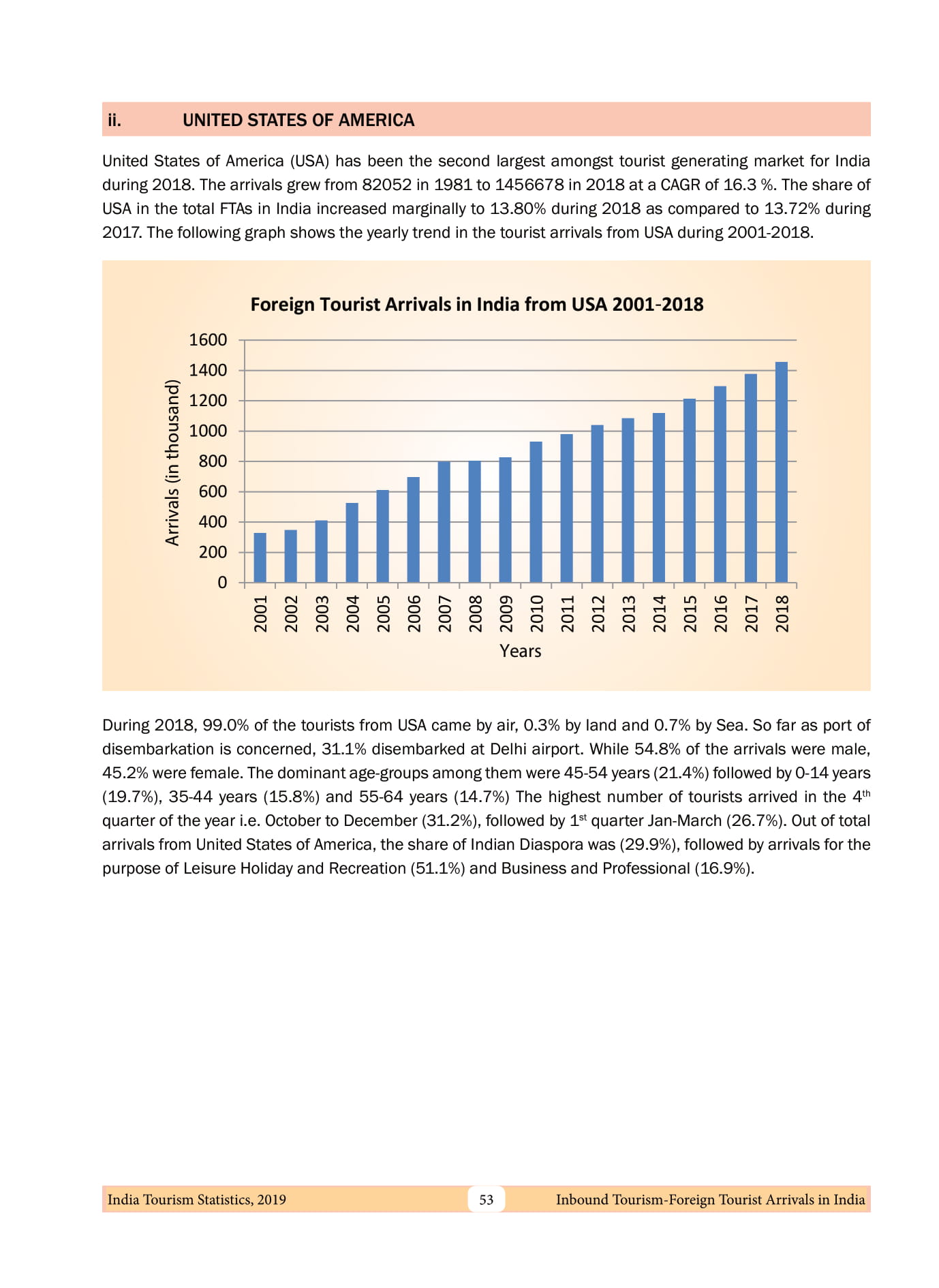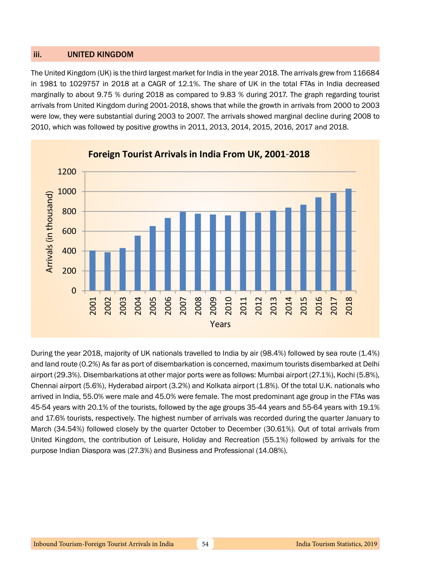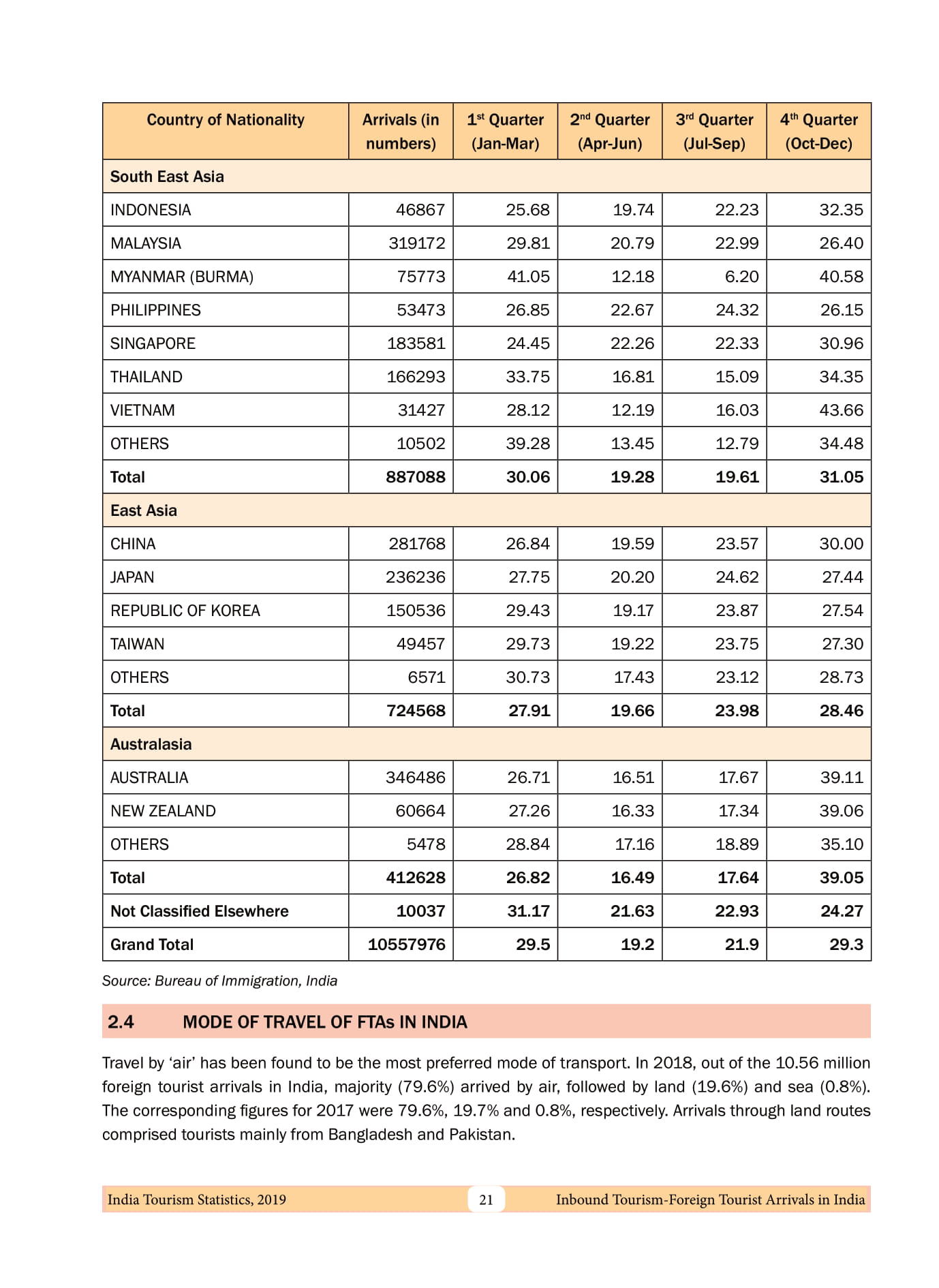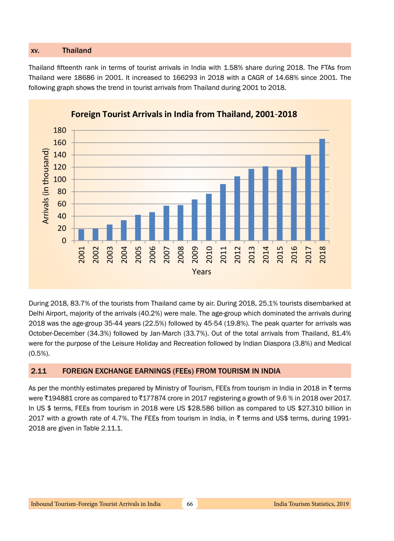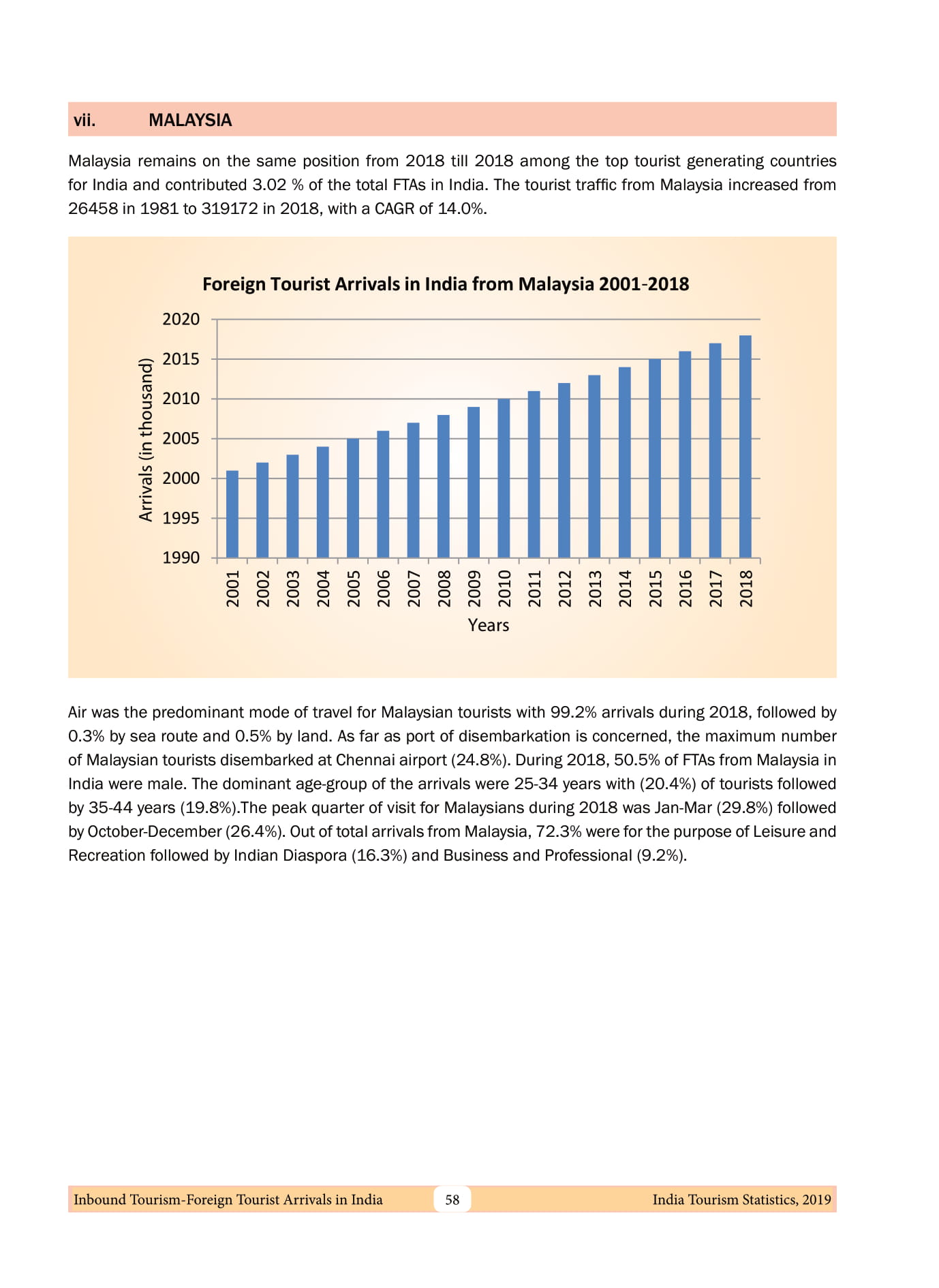 约79.6%的外国游客通过空中进入印度,其次是陆路(19.6%)和海路(0.8%)。德里和孟买机场约占印度外国游客总数的44.5%。2018年印度外国游客前15大来源地市场是孟加拉国,其次是美国、英国、斯里兰卡、加拿大、澳大利亚、马来西亚、中国、德国、俄罗斯、法国、日本、新加坡、尼泊尔和泰国。2018年,前15个国家约占印度外国游客总数的75.33%。