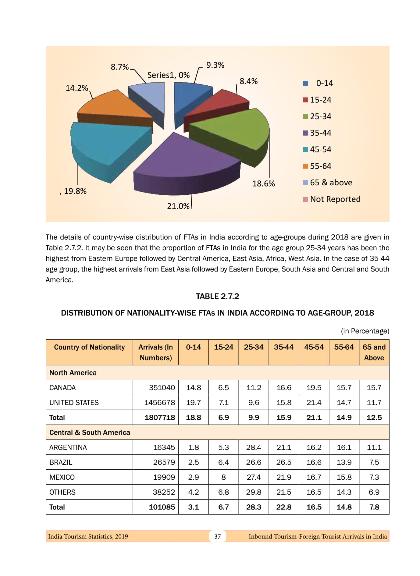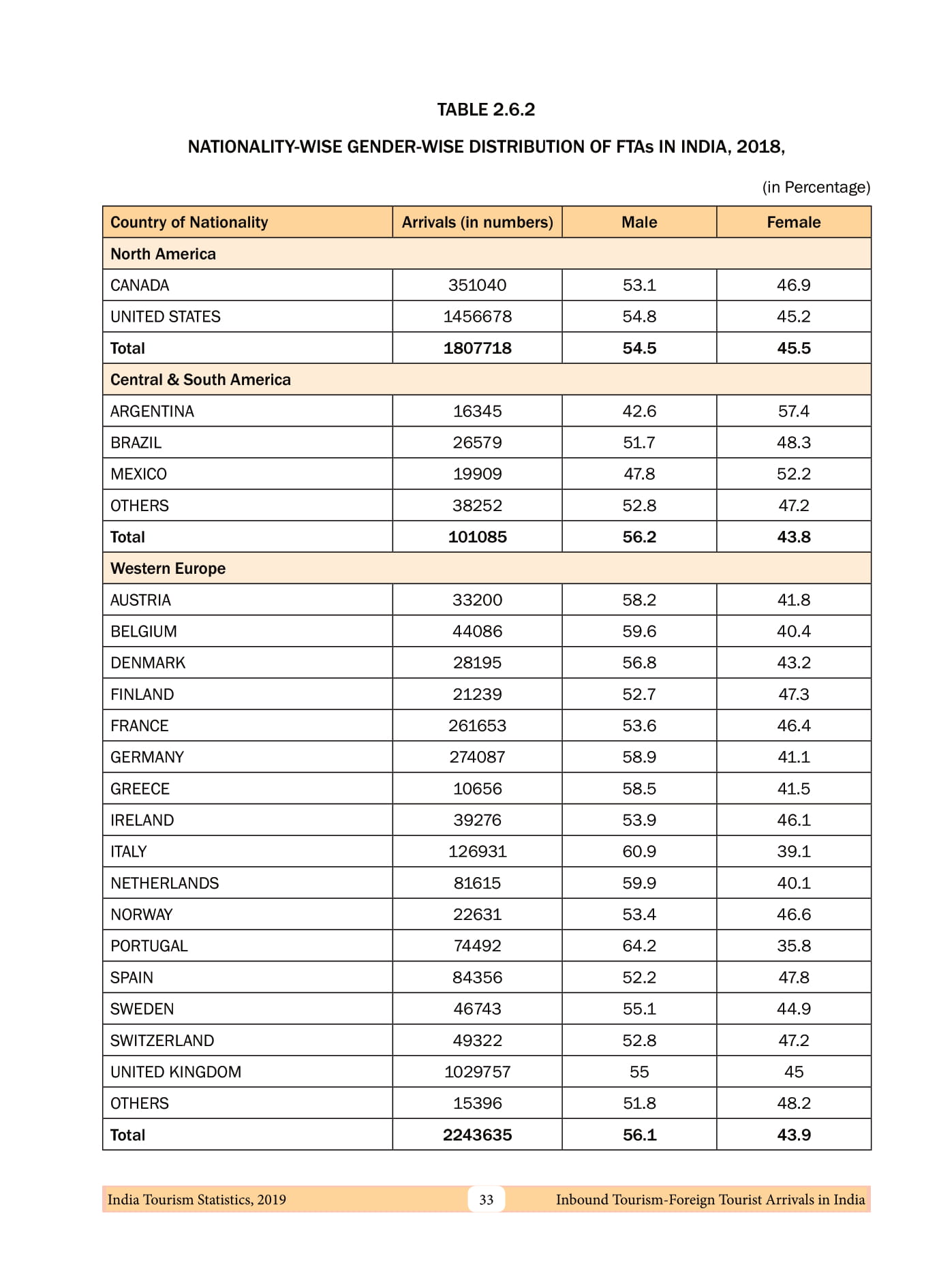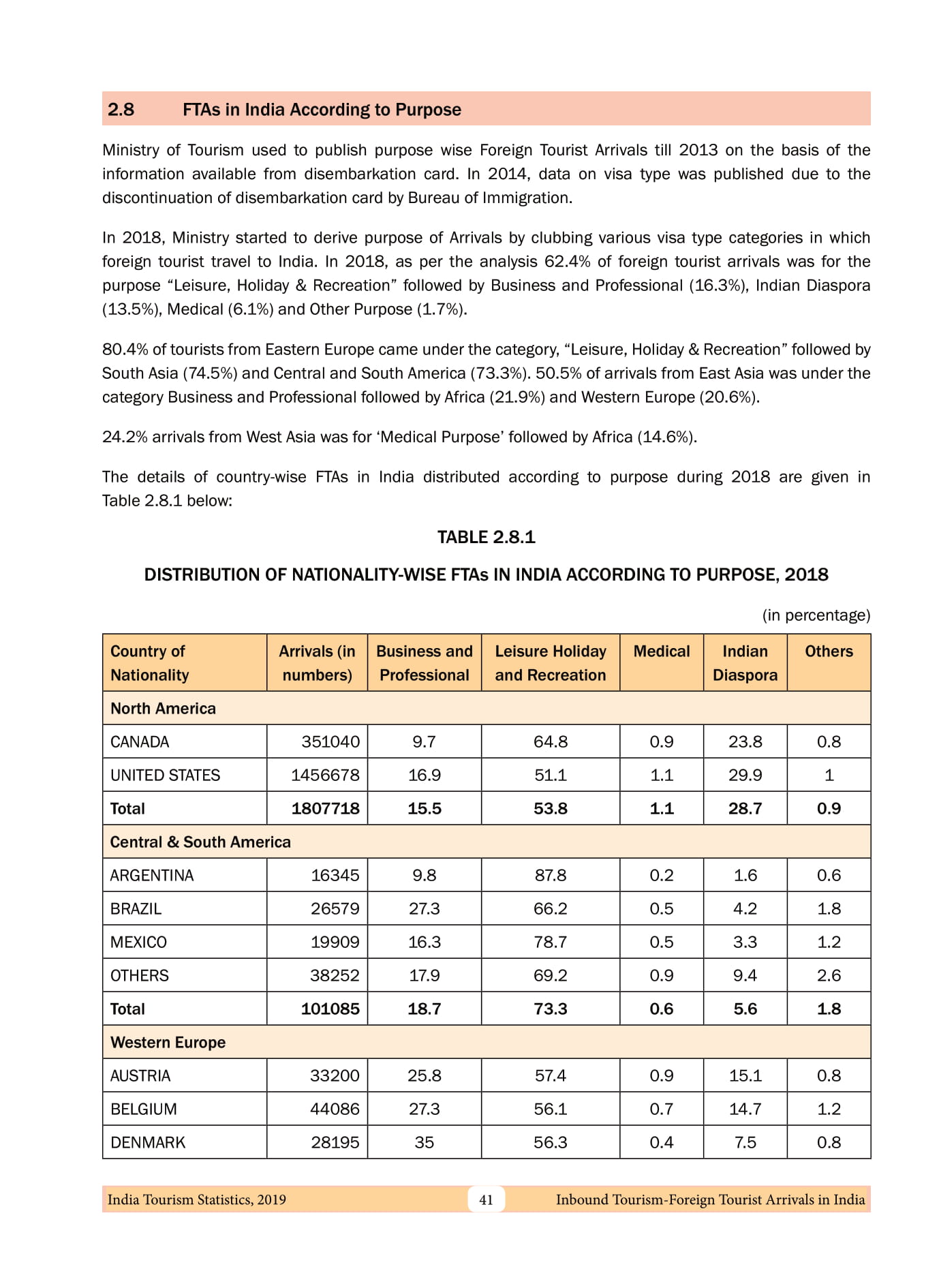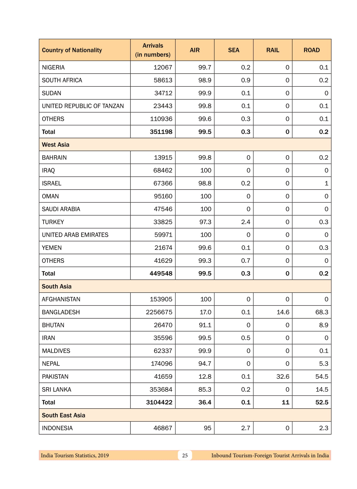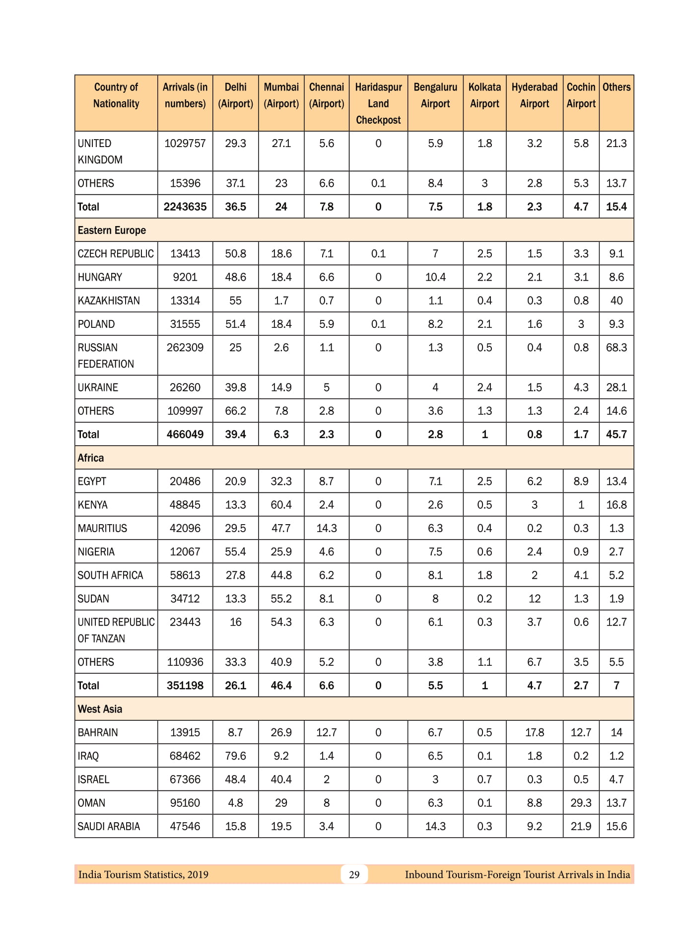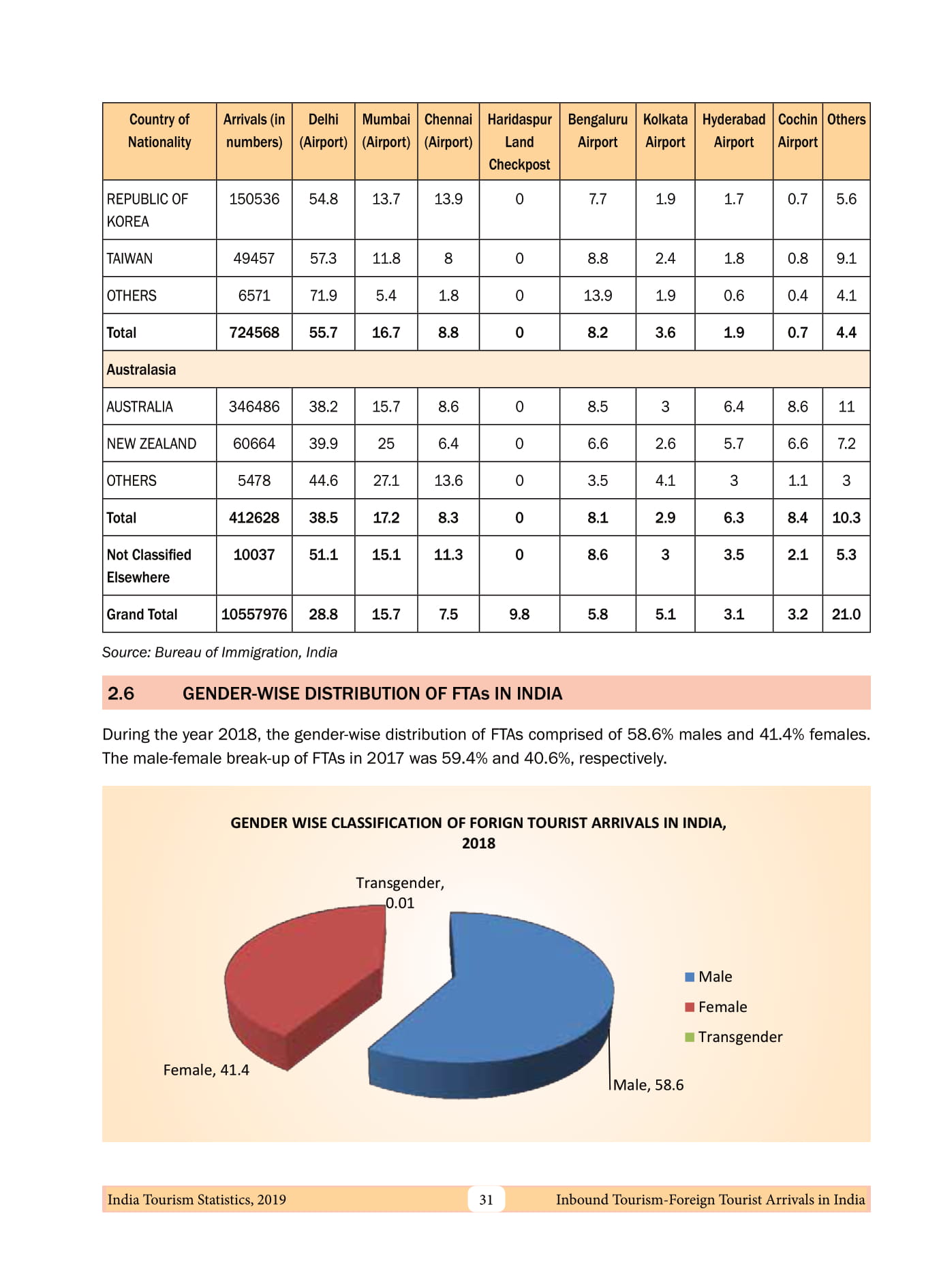 约79.6%的外国游客通过空中进入印度,其次是陆路(19.6%)和海路(0.8%)。德里和孟买机场约占印度外国游客总数的44.5%。2018年印度外国游客前15大来源地市场是孟加拉国,其次是美国、英国、斯里兰卡、加拿大、澳大利亚、马来西亚、中国、德国、俄罗斯、法国、日本、新加坡、尼泊尔和泰国。2018年,前15个国家约占印度外国游客总数的75.33%。