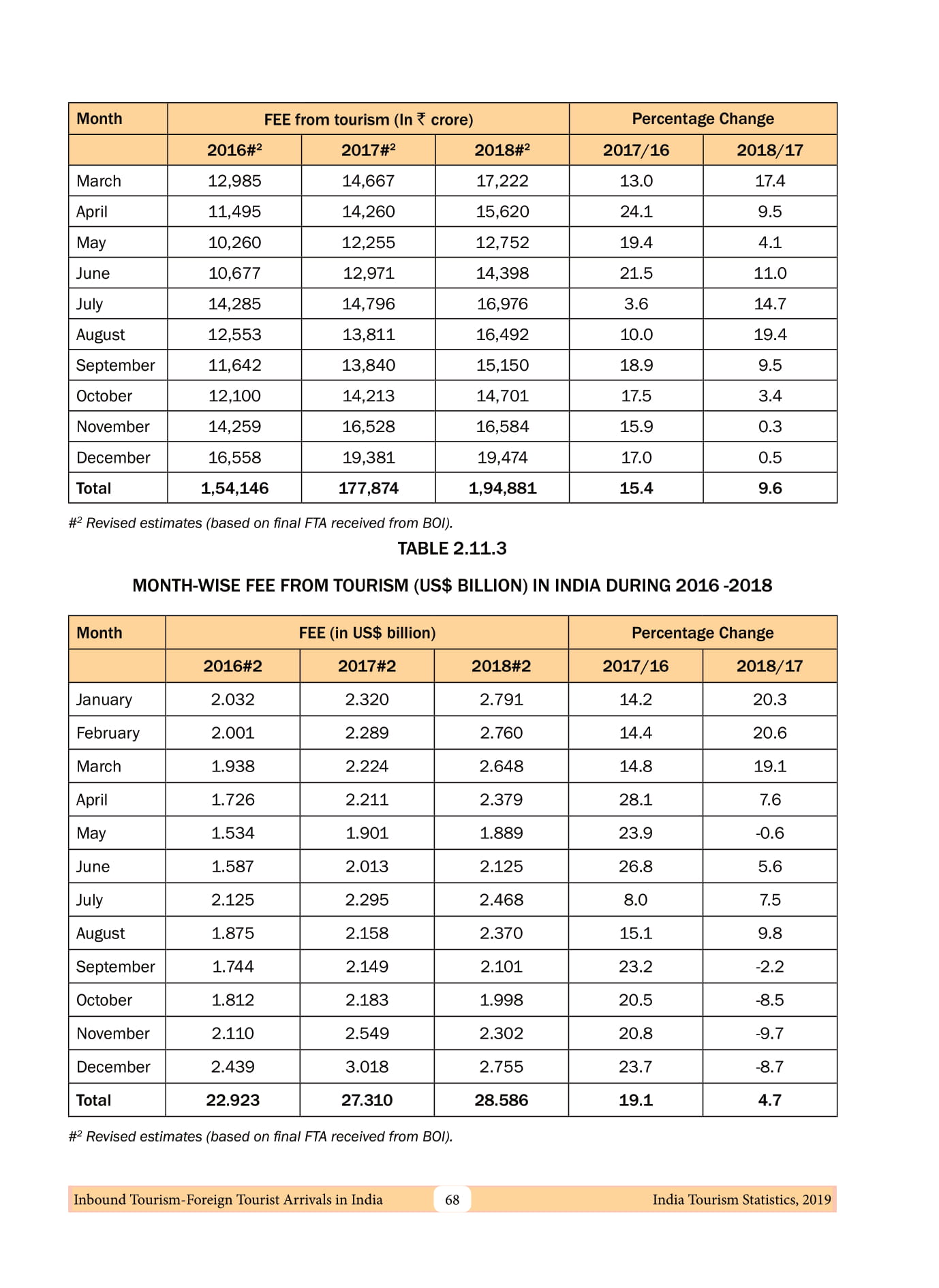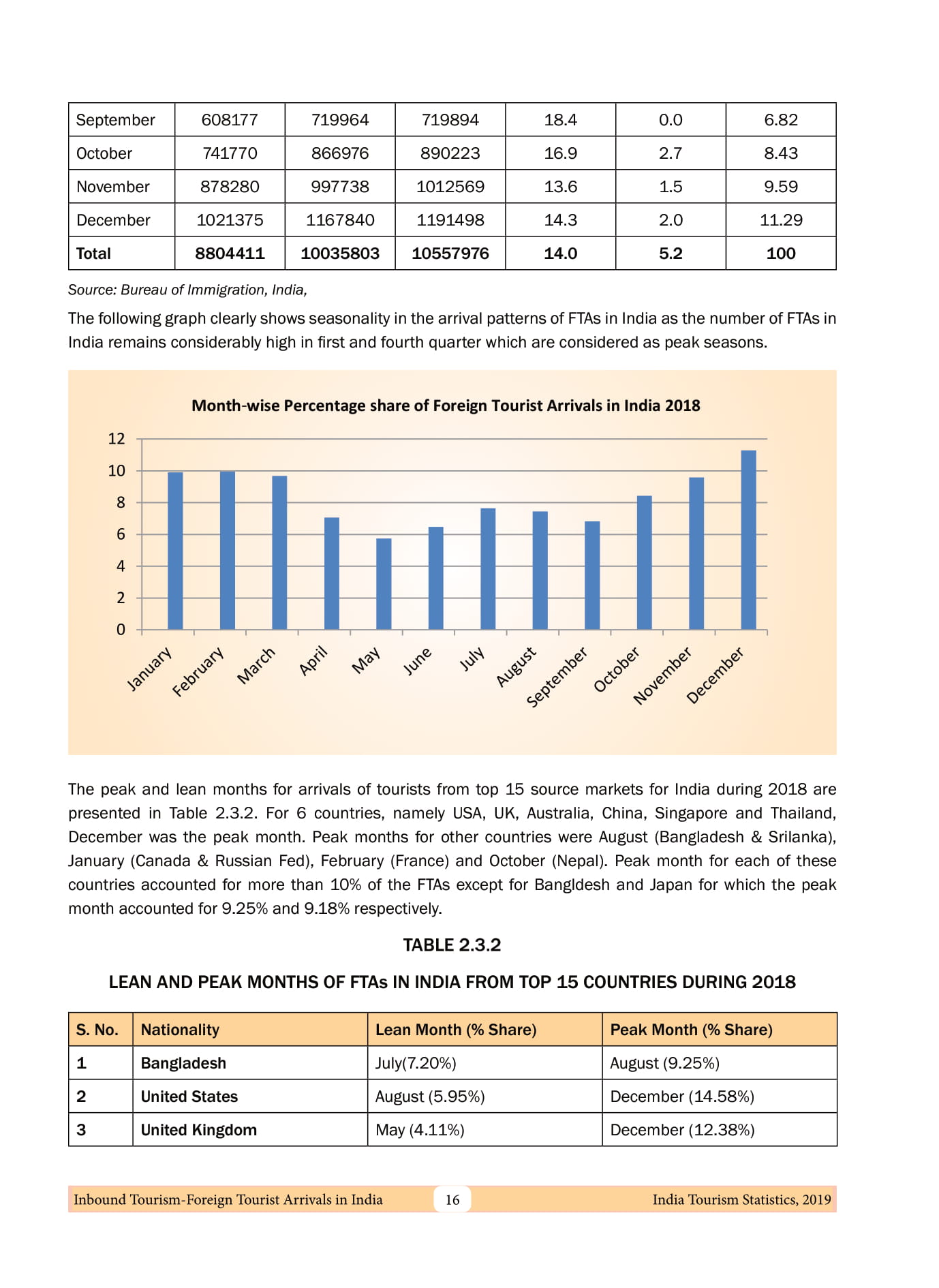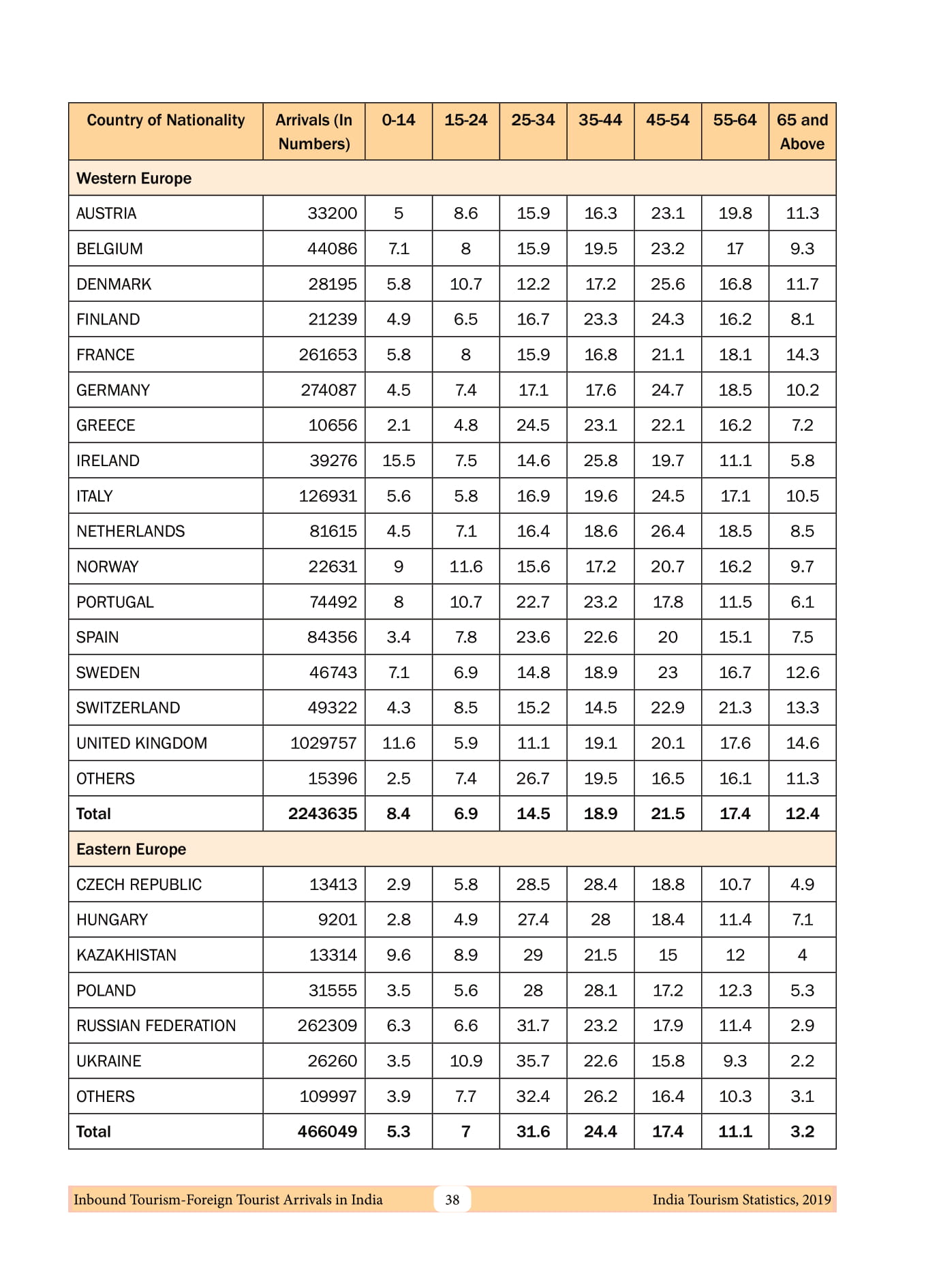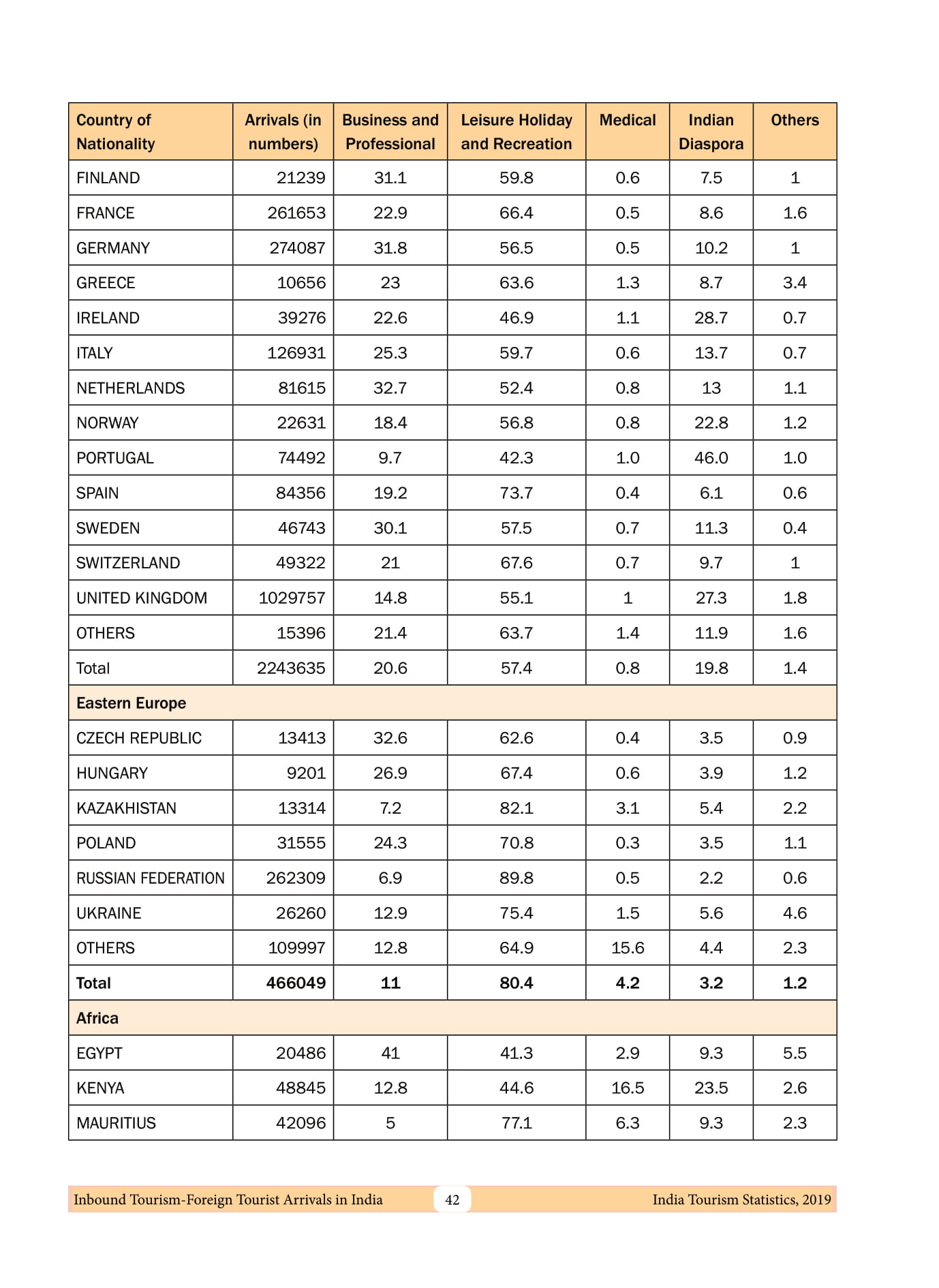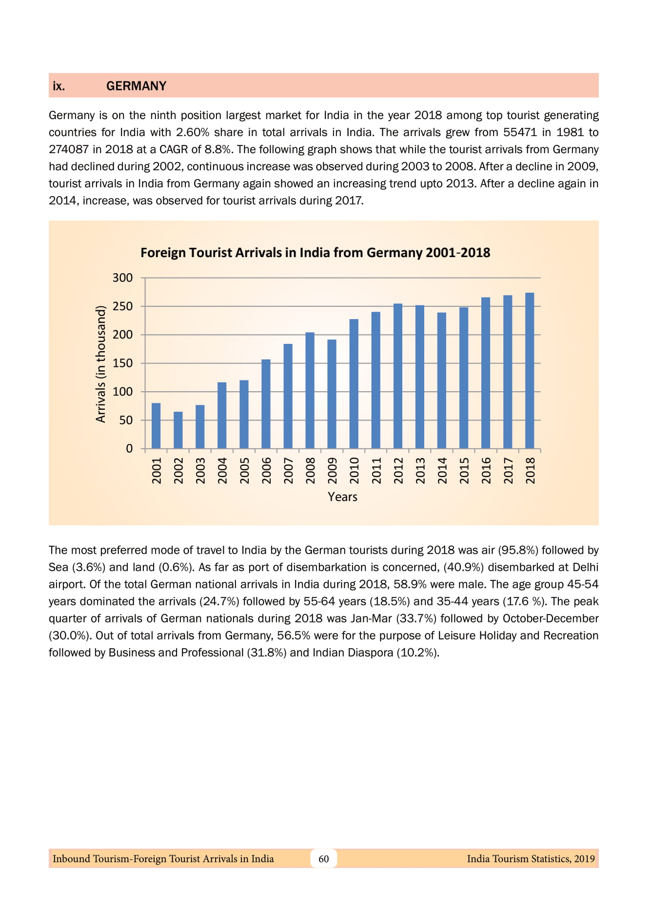 约79.6%的外国游客通过空中进入印度,其次是陆路(19.6%)和海路(0.8%)。德里和孟买机场约占印度外国游客总数的44.5%。2018年印度外国游客前15大来源地市场是孟加拉国,其次是美国、英国、斯里兰卡、加拿大、澳大利亚、马来西亚、中国、德国、俄罗斯、法国、日本、新加坡、尼泊尔和泰国。2018年,前15个国家约占印度外国游客总数的75.33%。