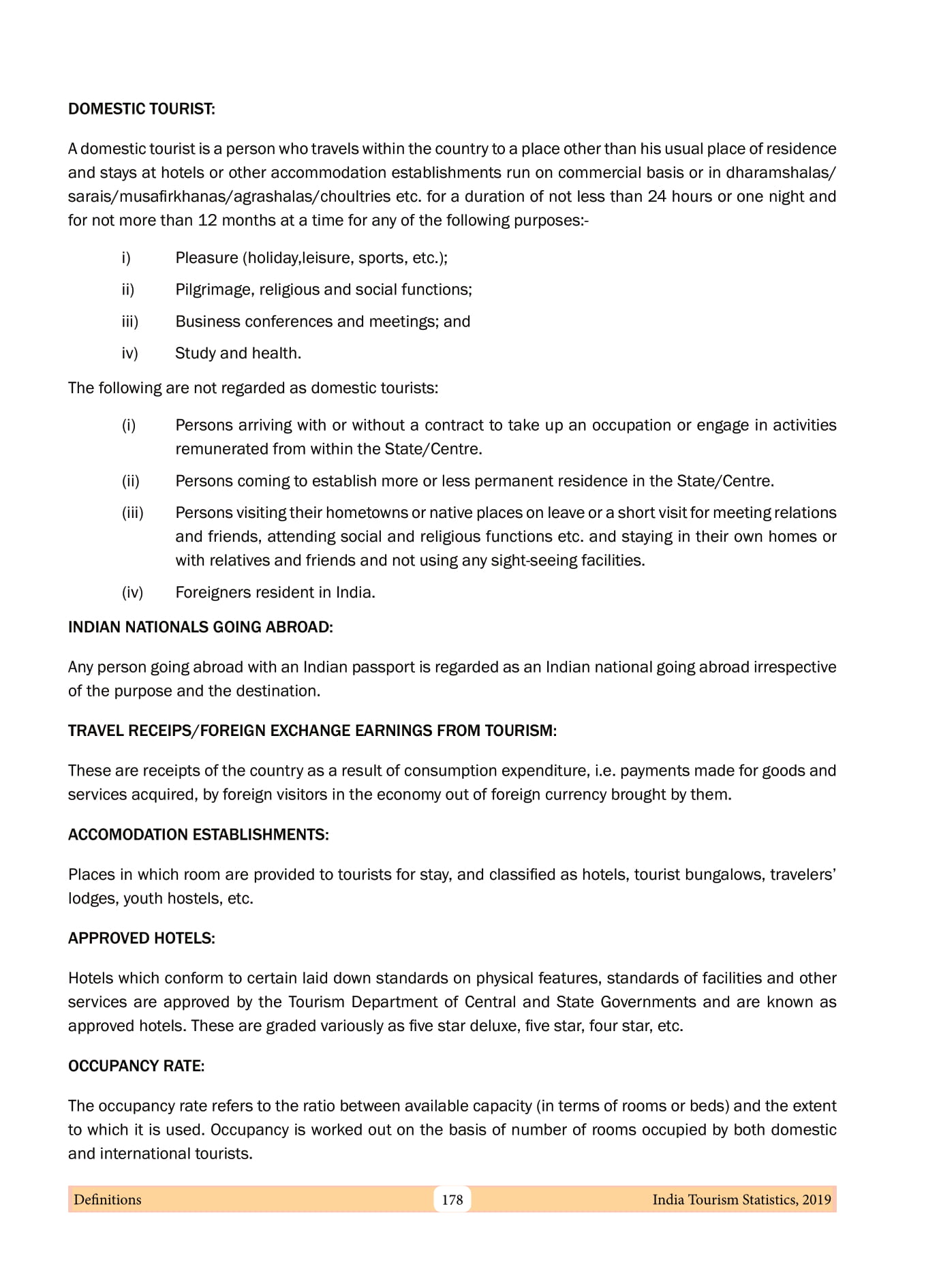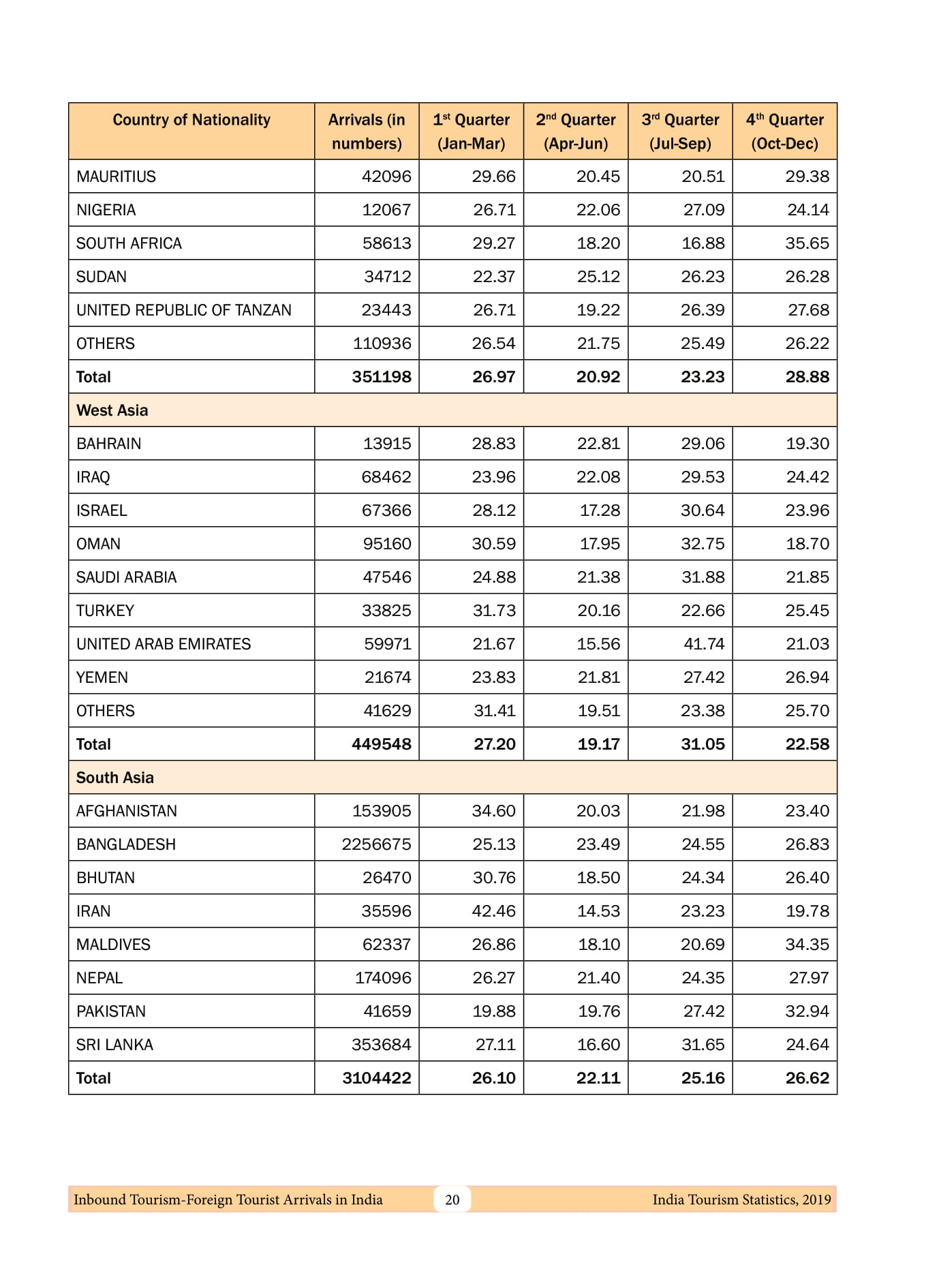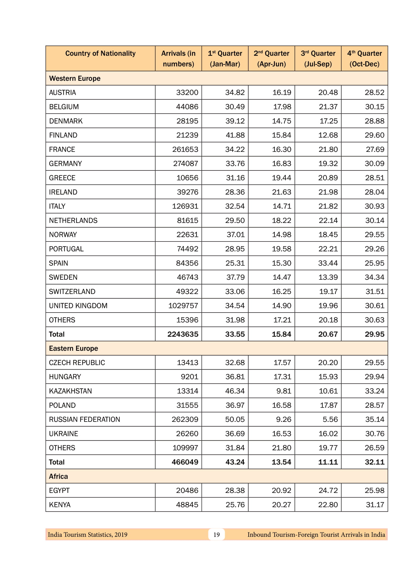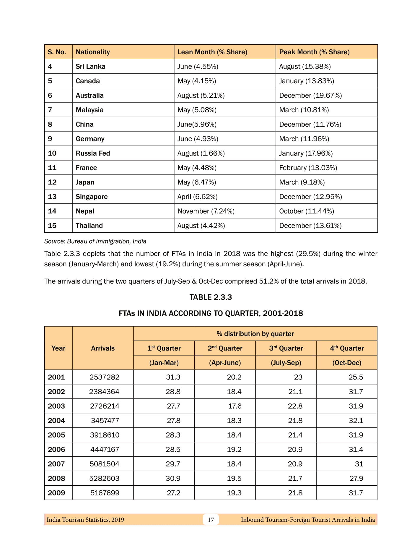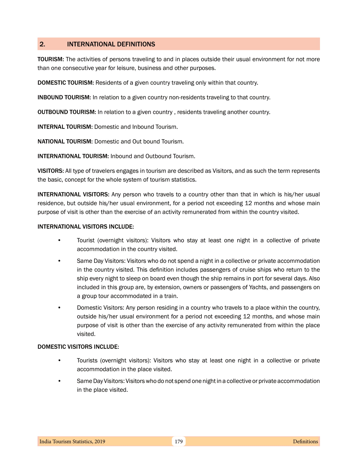 约79.6%的外国游客通过空中进入印度,其次是陆路(19.6%)和海路(0.8%)。德里和孟买机场约占印度外国游客总数的44.5%。2018年印度外国游客前15大来源地市场是孟加拉国,其次是美国、英国、斯里兰卡、加拿大、澳大利亚、马来西亚、中国、德国、俄罗斯、法国、日本、新加坡、尼泊尔和泰国。2018年,前15个国家约占印度外国游客总数的75.33%。