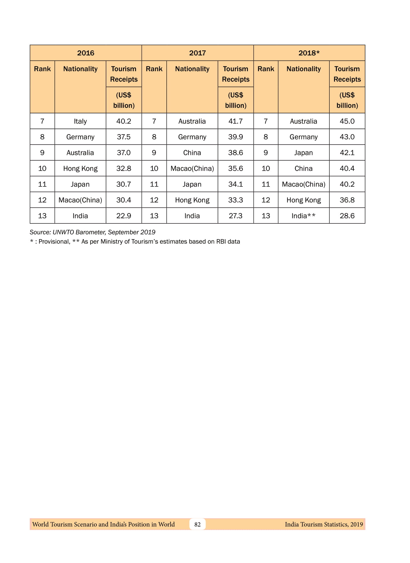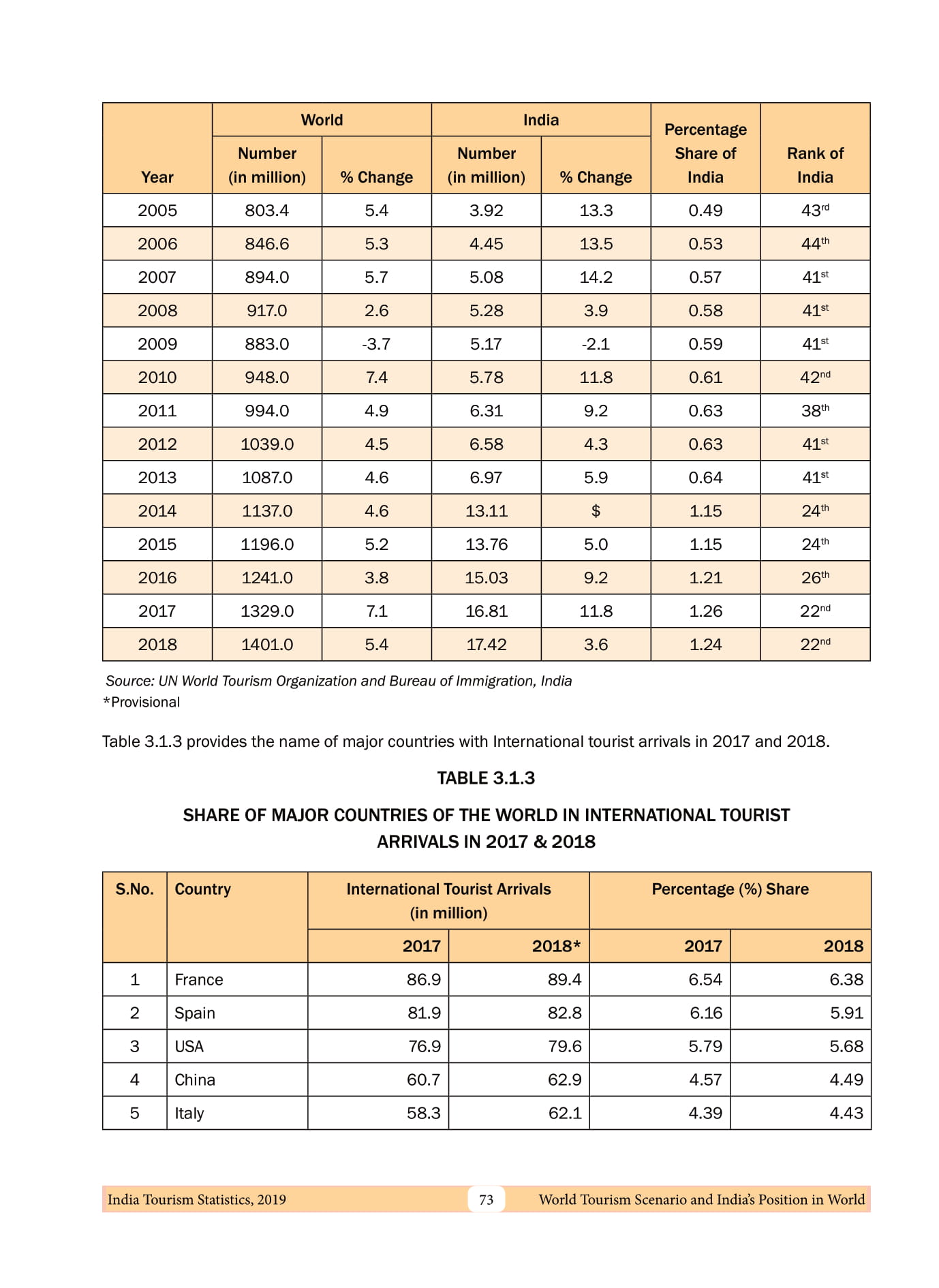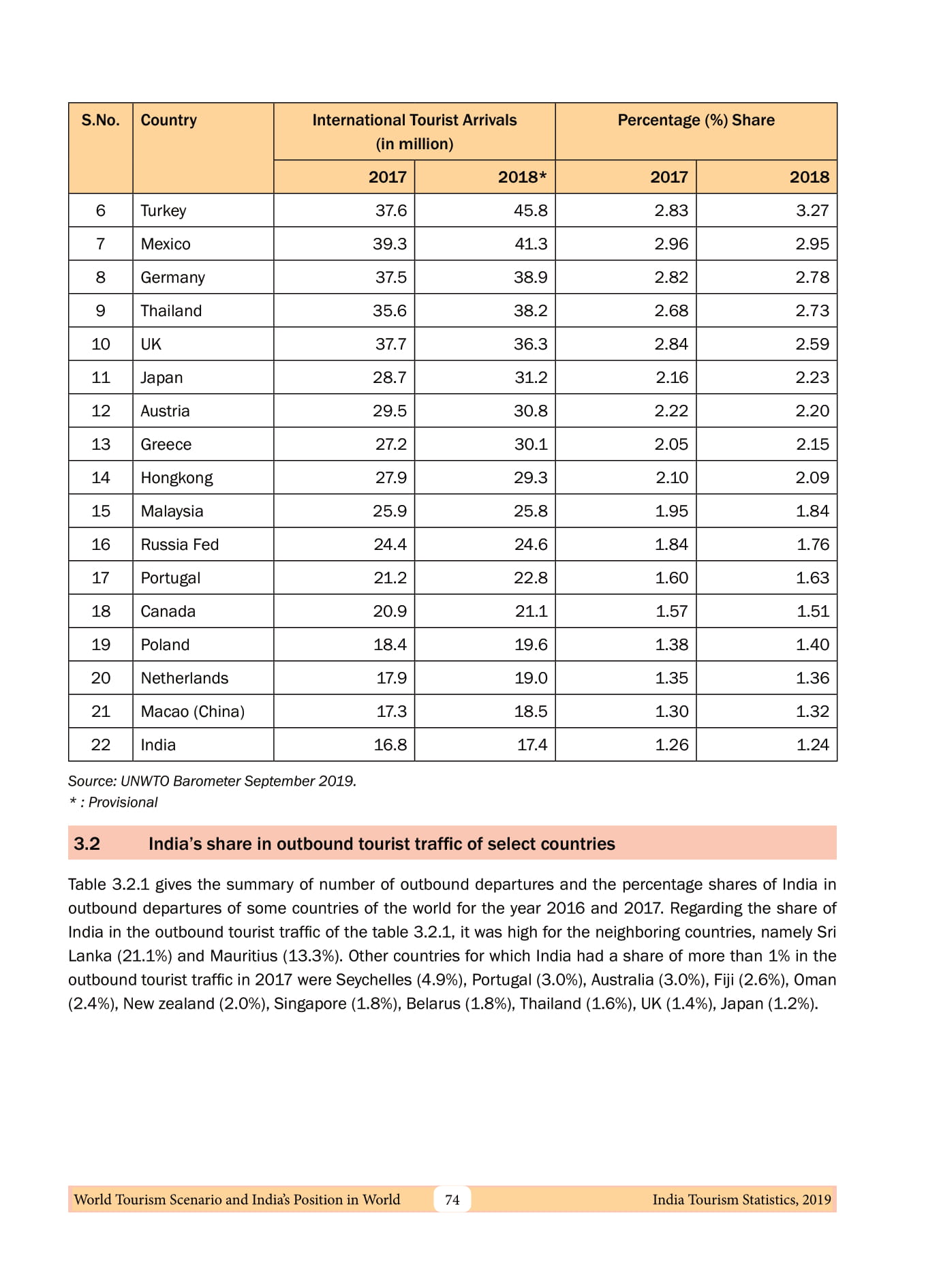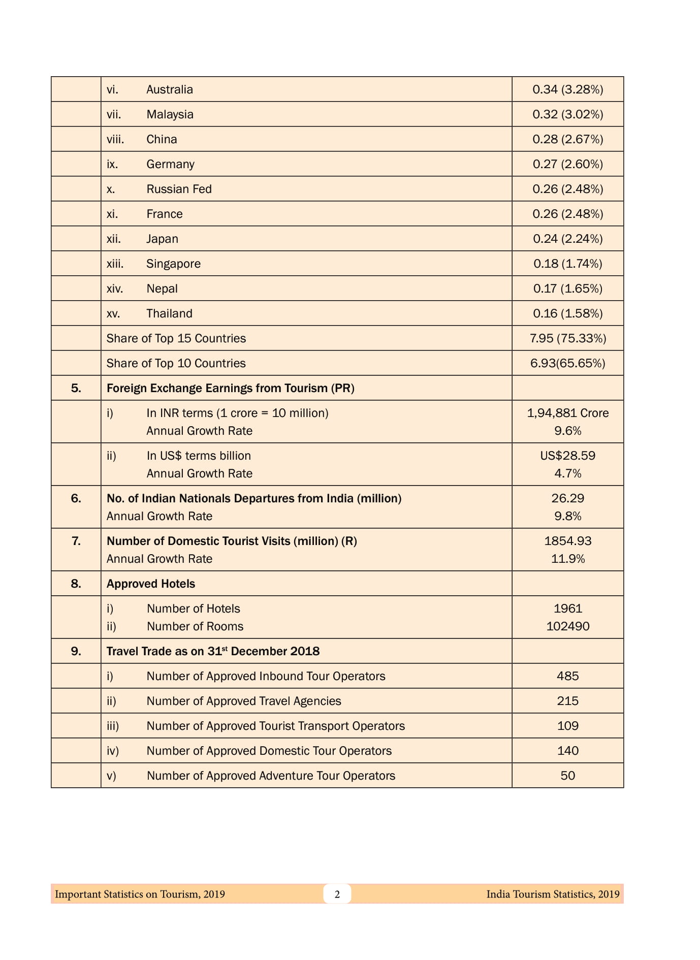 2018年印度在国际游客中的份额为1.2%。2018年抵达亚太地区的国际游客中有5.0%来自印度,排名第7。